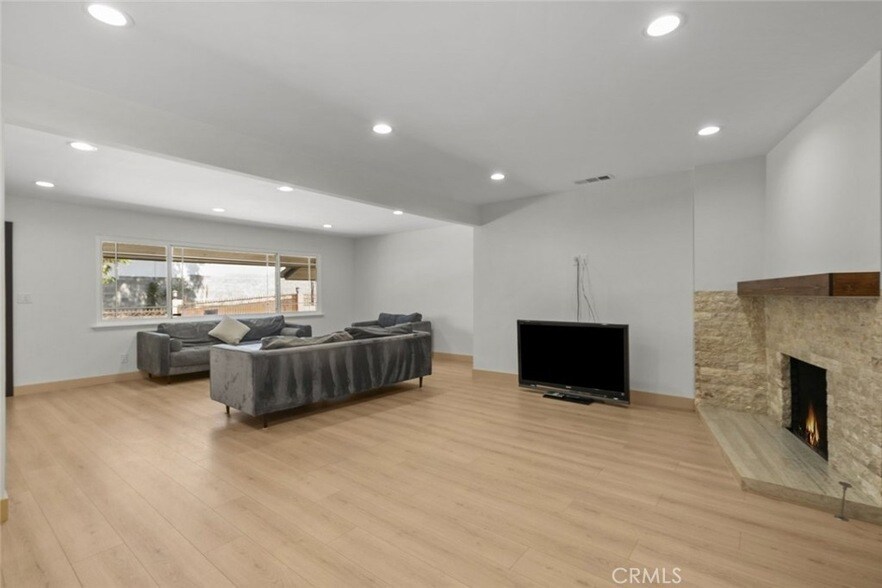 Bright and open home with newer carpet and updated windows. The kitchen includes plenty of cabinet space, recessed lighting, and a breakfast bar, opening to the dining area and family room with fireplace and sliding doors to a large enclosed patio with spa. Primary bedroom has an en suite bathroom and updated finishes. Two additional bedrooms and a modern full bath complete the layout. Also features indoor laundry, a bonus room for office or storage, a large backyard with fruit trees, and an attached garage with carport. Convenient location near parks, recreation, shopping, and freeway access.