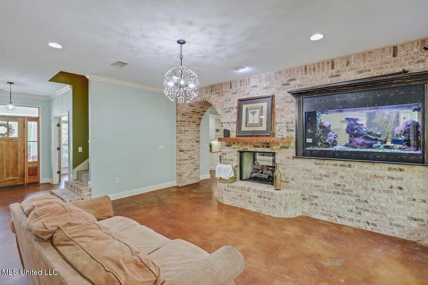 This fabulous home has over 4,000 square feet with 5 bedrooms, 4.5 baths and a huge bonus room! The primary bedroom has two closets and dual vanities along with a jetted tub and separate shower. There is an additional bedroom downstairs along with a full bath. Upstairs one bedroom has its own bath and the other two bedrooms share a full bath. There is a half bath in the huge bonus room. There's also a formal dining room or office and large laundry room downstairs. The focal point is the beautiful brick archway along with the built-in saltwater aquarium and double fireplace.