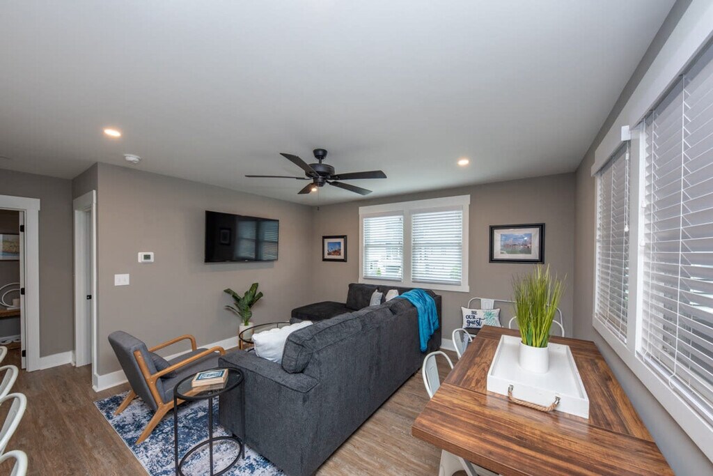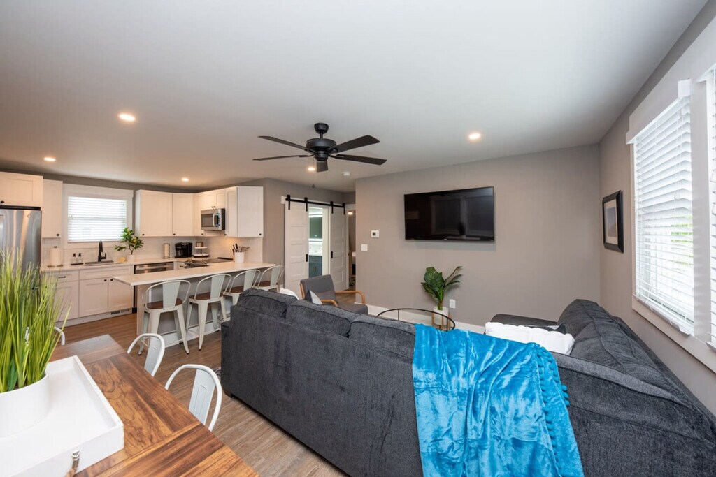 Nestled in the heart of Ocean City, this 2-bedroom, 1-bath apartment offers a stylish and comfortable retreat just a 10-minute walk from the beach and boardwalk. Enjoy a fully equipped modern kitchen with stainless steel appliances, a Smart TV, and a private patio with seating. Additional amenities include high-speed WiFi, in-unit laundry, and complimentary beach gear to make your stay seamless. This apartment is perfect for families and groups looking for a relaxing stay just steps from the beach and boardwalk. It features two well-appointed bedrooms with fresh bedding and towels provided, a full bathroom with high-quality bath essentials, and a fully equipped kitchen with stainless steel appliances and a Keurig coffee maker. The living room includes a sofa bed, and the apartment also offers in-unit washer and dryer. The neighborhood offers a charming and convenient setting for your stay. Just a short walk or bike ride away, the pristine Ocean City beach is perfect for sunbathing, swimming, and various water sports. The nearby boardwalk is a hub of activity with amusement parks, eateries, shops, and entertainment options, offering fun for all ages. The area boasts a variety of dining options ranging from casual beachside cafes to more upscale restaurants. Explore local boutiques, surf shops, and convenience stores for all your shopping needs. There are several parks and recreational areas nearby, such as the Ocean City Community Center, which includes a playground, tennis courts, and sports fields. The Ocean City Golf Course is just a short drive away, offering a relaxing round of golf with beautiful scenery. For those interested in fishing or boating, there are numerous charters and rental services available nearby. Ocean City is known for its family-friendly atmosphere, with plenty of activities and events geared towards children and families. The neighborhood is well-connected by local public transportation, making it easy to explore the wider area without needing a car. Ocean City is very bike-friendly with numerous bike rental shops and bike lanes, allowing for easy and enjoyable exploration of the island. Ocean City hosts a variety of seasonal events and festivals throughout the year, including parades, concerts, and holiday celebrations. These events add to the vibrant community atmosphere and offer entertainment for visitors of all ages. The apartment accommodates a maximum of 8 guests and enforces quiet hours from 10:00 PM to 8:00 AM. Pets are not allowed, and smoking indoors is strictly prohibited. Any evidence of smoking will result in an additional cleaning fee. The apartment features self-check-in for easy access. Security cameras are present on the exterior front entryway, rear entrance, and deck/patio/driveway area, recording audio and video footage 24/7. There are no recording devices inside the apartment or any other private area. This apartment offers high-speed WiFi, making it perfect for remote work and video calls.