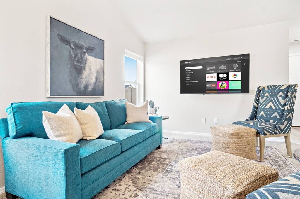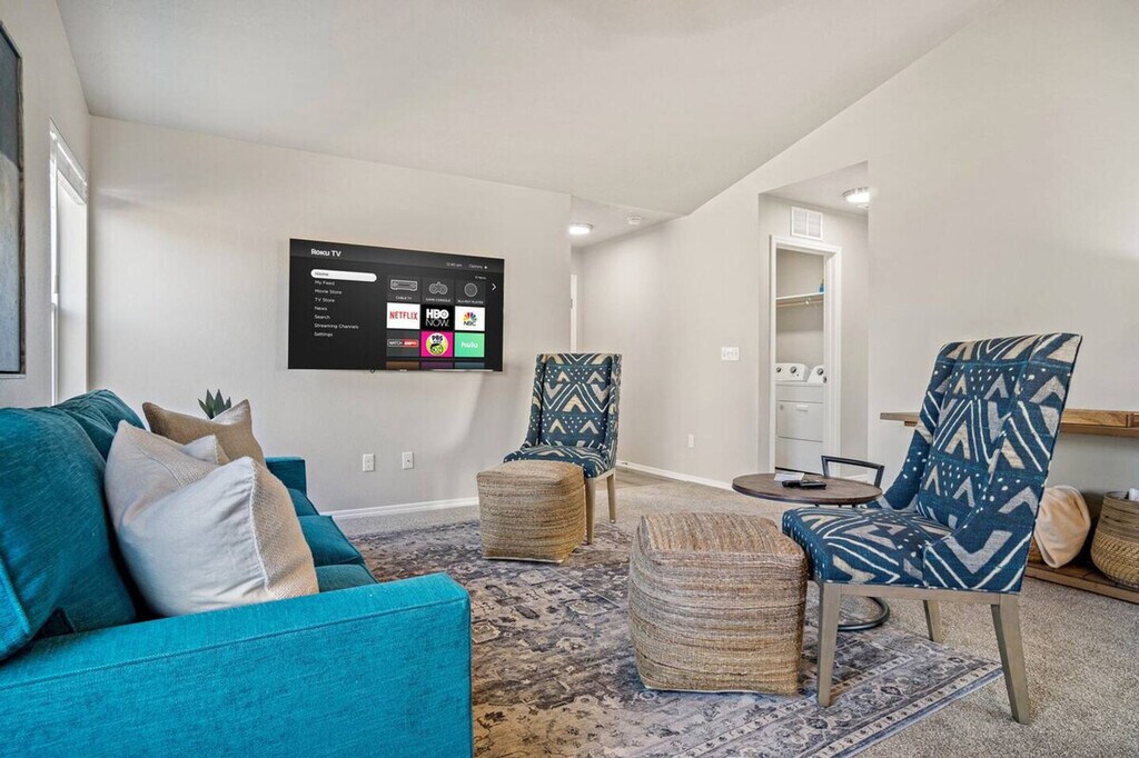 Stay in this newly built, gorgeous home in Caldwell and feel at home with its fast Wi-Fi, large TVs in the master and living room, and a fully equipped kitchen. This professionally cleaned and sanitized residence offers a spacious backyard for relaxation and is conveniently located 5 minutes from I-84 and 10 minutes from Indian Creek Plaza. The beautifully decorated space, designed by a local interior designer, features a master bedroom with a huge king-size bed, a queen-size bed, two twin-size beds, and a sofa in the main living room. The kitchen is fully equipped with appliances such as a microwave, fridge, electric stove, and dishwasher, along with glasses, mugs, dishes, and cutlery. Complimentary Wi-Fi and coffee are provided, along with a starter pack of toiletries. Secure double car garage parking is available for your convenience. This home is ideally situated for easy access to all of the Treasure Valley, being just 5 minutes from I-84. Enjoy the proximity to Indian Creek Plaza, only 10 minutes away, and a small park with a playground area on the same block. The home permits occupancy for up to 7 people. Easy self-check-in is available via a secure door keypad. Guests are welcome to use any part of the home and yard, except for two bins in the garage reserved for cleaning crew supplies, which are locked. The home is remote work-friendly with fast Wi-Fi, making it ideal for working remotely.