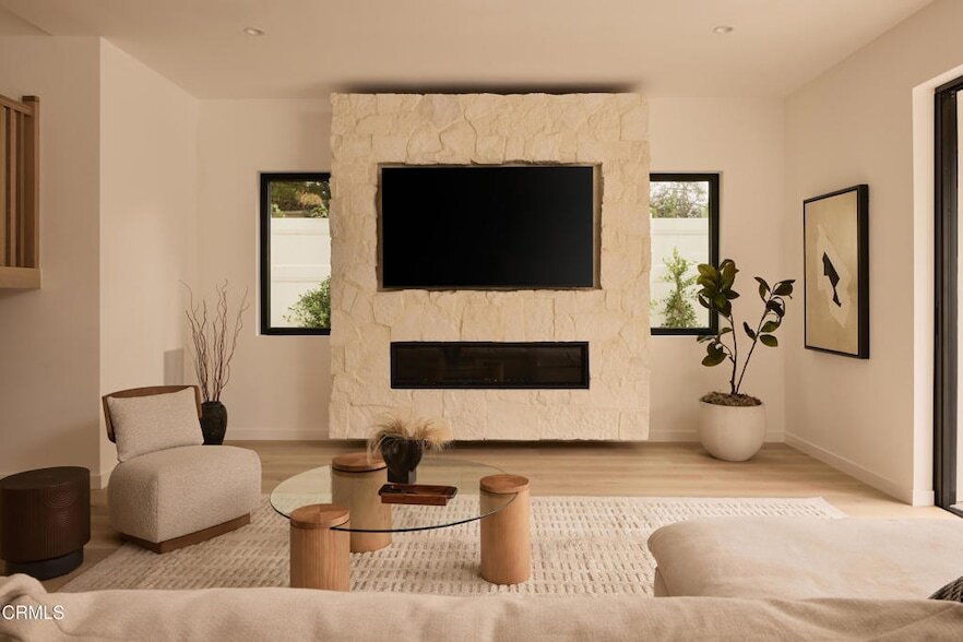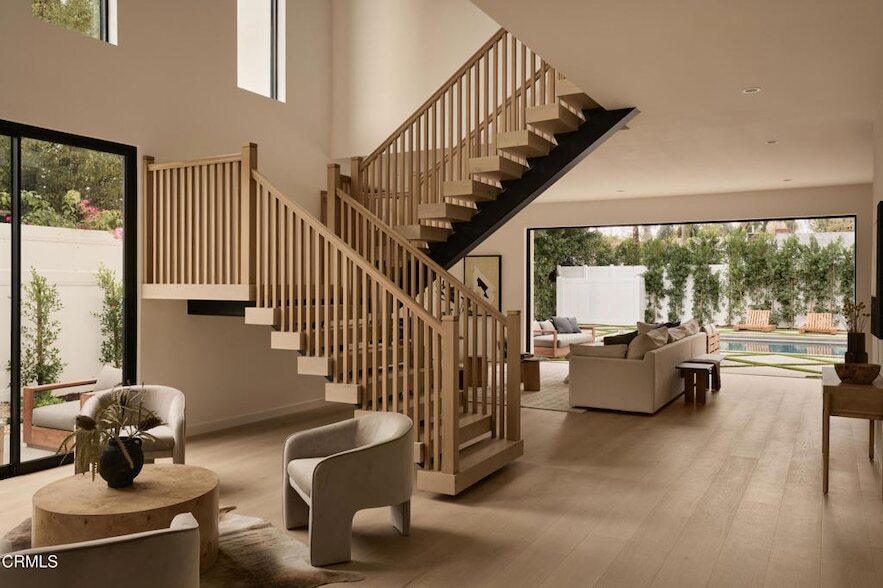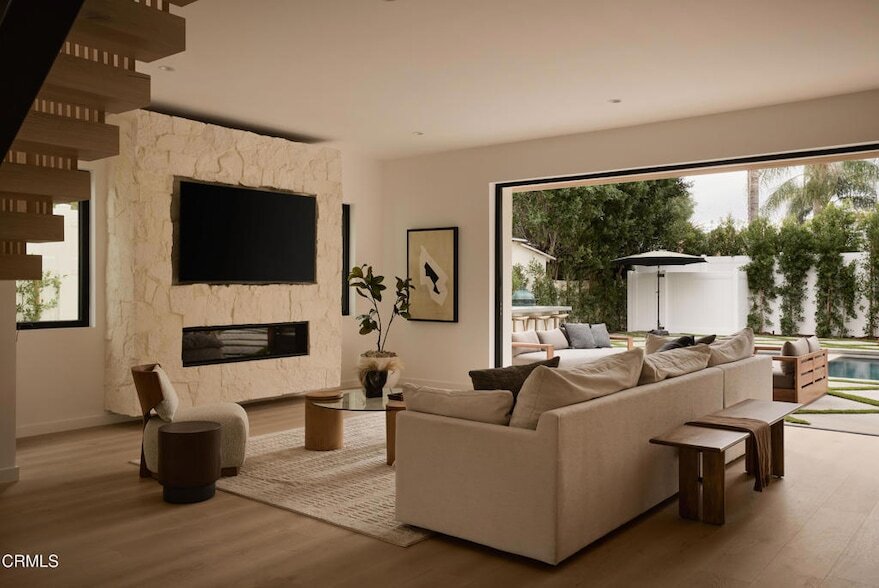 Stunning new construction in Valley Village by Axe Construction. This modern warm residence blends elevated design with everyday functionality, offering a layout made for real living and effortless entertaining. Offered fully furnished for a turnkey experience.A grand double-height entry anchors the home, showcasing a custom wood staircase and an open floor plan filled with natural light. The main living space frames views of the backyard through large sliding glass doors that create a true indoor outdoor flow. The kitchen features integrated appliances, a large island, and a walk-in pantry with additional prep space.The home includes five bedrooms in total. Downstairs offers one full bedroom with en-suite, ideal for guests or flexible use. Upstairs are four additional en-suite bedrooms, including a standout primary suite with vaulted ceilings, a generous walk-in closet, and a private balcony overlooking the property.The backyard is fully finished with a pool and spa, outdoor kitchen with built-in BBQ and Green Egg, and multiple seating zones surrounded by greenery.Additional features include an upstairs laundry room, full home security system, smart home integration, and timeless finishes throughout. This is refined Valley Village living crafted with intention, quality, and comfort.