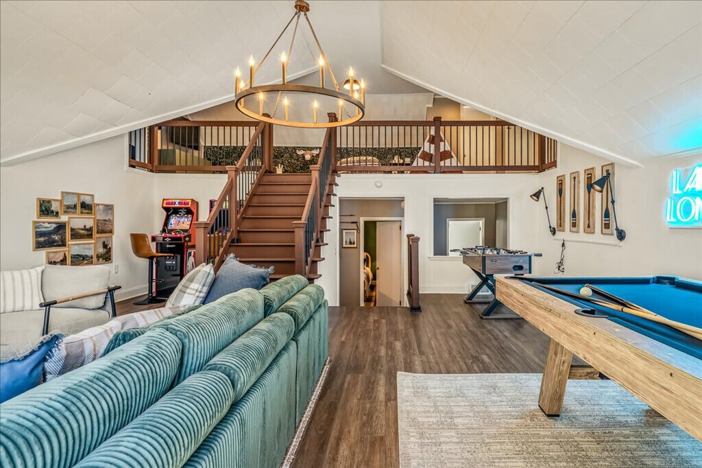 Feel at home in this 3-bedroom, plus 3-bonus rooms home in Long Pond, PA, offering everything you need for an amazing vacation. This beautifully designed home offers generous space, featuring multiple cozy bedrooms, a fully equipped kitchen with high-end stainless appliances, ample cabinetry and cooking space, and a coffee maker with Keurig, drip, and French press options, and inviting living spaces. Enjoy endless entertainment with a game area featuring a pool table, foosball table, and arcade games, a movie room with a projector and popcorn machine, and a kid’s play area with books and toys. Outdoors, the fun continues with a kid’s playground, a soothing hot tub, a fire pit, an outdoor patio/dining area, a BBQ grill, and direct lake access with four kayaks available for guest use. Up to two dogs are allowed for a fee of $125 per stay. Nestled in the heart of the Poconos Mountains Region, this home offers the perfect blend of comfort and adventure. Nearby attractions include Pocono Outdoor Adventure Tours (0.5 miles), Pocono Raceway (1 mile), Emerald Lakes (East & West) (2 miles), Long Pond Preserve & Hauser Nature Center (3 miles), and Kalahari Resorts & Convention Center (4.5 miles). Dining options include Woody’s Country House (1.5 miles), Sortino’s Italian Kitchen (4 miles), The Water’s Edge Restaurant (5 miles), Mi Casa Restaurant (5.5 miles), and Chat-n-Chew Cafe (2.5 miles). Renting a car is a convenient option to explore the area, and rideshare services like Uber and Lyft are readily available. Check-in is at 4 pm and check-out is at 10 am. No cats are allowed. Guests must be 21 years or older to book this property. No parties are allowed, and violations may result in immediate termination of the stay. An exterior camera is installed solely to monitor the cleaning team for quality and security purposes. Parking is available for six vehicles in the driveway, and street parking is allowed. Guests are kindly asked to ensure that their dog is crate trained and that they pick up after their dog. Bedroom 1 includes a dedicated workspace. [SI]