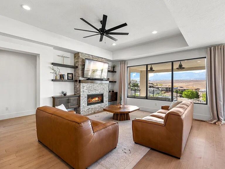 Property Id: 2312673 Nestled in Hurricane valley with sweeping views of Pine Valley Mountain and the Greater Zion Region, this home blends modern comfort, thoughtful design, and plenty of space for everyone. This home leaves no stone unturn. The main level showcases gorgeous wood floors, a solid wood front door, and a striking entry with herringbone detail and modern chandelier. The living room highlights the views with oversized windows, while the kitchen features wood cabinetry, stone backsplash, a walk-in pantry, white quartzite counters, and premium appliances including an LG fridge and Frigidaire oven. A cozy casita with its own entrance, mini split, kitchenette (mini fridge and microwave), and bathroom offers flexible guest space. The primary suite is a true retreat with its own washer and dryer, soaking tub, rain head shower, closet built-in drawers, and direct access to the main laundry. Additional touches include a guest bath with a Onyx stone sink, wood-capped stairs, built-in cabinetry, and large windows throughout for natural light. Entertainment and functionality shine in the walk-out basement with a full kitchen, laundry, and a movie projector with screen, plus mini splits for comfort. The lower level has a full kitchen, 2nd living room, 2 bedrooms, and 2 bathrooms. Upstairs you'll find a spacious loft, while the home also boasts epoxy-finished garage floors, solar panels, and smart storage solutions. Outdoor living is easily accessed with two covered patios, a hot tub, deck with stairs, garden boxes, in-ground trampoline, fire pit, and extra parking on the side. Every detail, from the wood finishes to the modern fixtures, makes this home both welcoming and impressive.