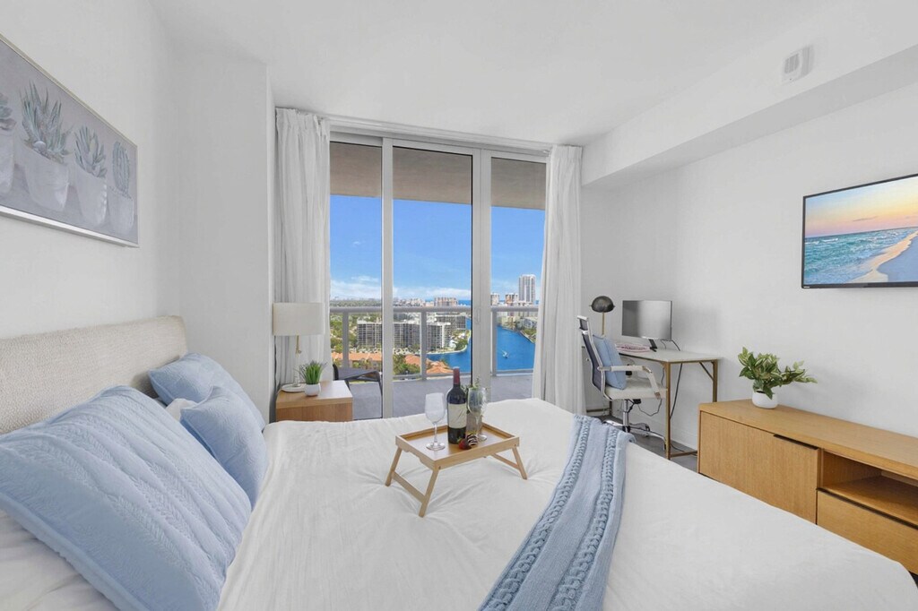 The advertised rate of $4,626/month is the lowest available price, based on a 30 day(s) stay with a move-in date of August 24, 2026. Rates vary depending on the duration of stay, season, and other parameters. For exact pricing and additional pricing components, please visit our website and enter your desired move-in and move-out dates. The rate is applicable when billed upfront; it can be higher if billed in multiple payments. Feel at home in this spectacular upper-level apartment at Beachwalk Resort, designed by Pininfarina (Ferrari), with private stunning views. This spacious apartment features 2 bedrooms and 2 full baths. Enjoy the balcony with stunning views of the Atlantic Ocean, Intracoastal Waterway, and downtown skyline. This unit offers a fully equipped kitchen with a stainless steel refrigerator/freezer, glass stove, integrated oven, silent dishwasher, integrated microwave, stove, dishes, coffee maker, hairdryer, electronic safe, iron/ironing board, in-suite washer/dryer, and TVs in each room. Guests have access to a fitness center and a free shuttle service to the beach (3 minutes away). Wireless internet is included. A Pack 'N Play crib is available upon request, and package handling is available for $5 per package plus applicable taxes. Valet parking is available for a fee: 1 to 7 days for $28 per day per vehicle, plus taxes; 8 to 10 days for $25 per day per vehicle, plus taxes; 11 to 19 days for $250 per stay per vehicle, plus taxes; and 20 to 30 days for $295 per stay per vehicle, plus taxes. Located at the corner of Hallandale Beach Boulevard and the Intracoastal Waterway, this apartment is equidistant from Miami Beach to the south and Fort Lauderdale to the north. It's just one easy block to the beach and minutes from nightlife, dining, shopping, and recreation. The Hollywood Beach boardwalk and Blue Wave-designated beaches are nearby, surrounded by restaurants and the world-famous Gulfstream Park. The Hard Rock Guitar Hotel & Casino is to the west, Aventura Mall to the south, and more shopping and restaurants in Fort Lauderdale to the north. Fort Lauderdale Airport is minutes away. A 24-hour Walmart is next door, and a Publix Supermarket is a two-minute drive away. Instacart deliveries are also welcome. Beachwalk Resort imposes additional mandatory fees that are not included in the nightly rate. These fees are collected separately at check-in and are required to complete your reservation with the property. Stays of 1 to 7 nights: $30 resort fee per day, plus taxes; stays of 8 to 14 nights: $25 resort fee per day, plus taxes; stays of 15 to 29 nights: $20 resort fee per day, plus taxes; stays of 30 nights or more: $300 resort fee per month + $10 for each additional day, plus taxes. A $500 fine will be applied for any smoking violation. Please keep all doors closed and the air conditioning on at all times to prevent condensation and property damage. Quiet hours are from 10:00 PM to 07:00 AM. Excessive noise or property damage may result in penalties. [SI]