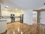 This turn-key home features elegant wood floors on the first level, enhanced by custom paint. The kitchen offers white cabinets and solid surface counters. The functional layout includes all 3 bedrooms and the laundry room upstairs, a 2-car garage, ceiling fans, and a low-maintenance desert-landscaped yard. All appliances are included.