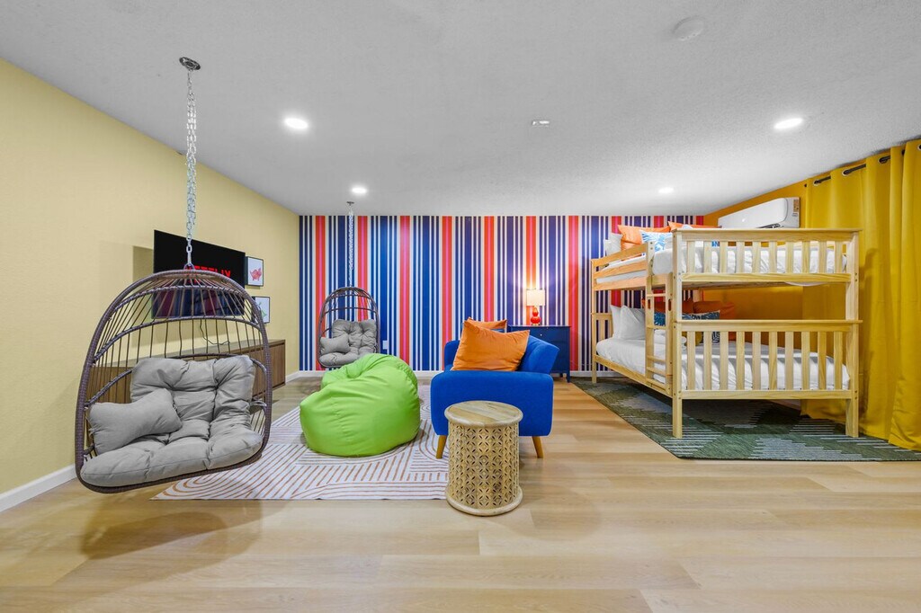 Feel at home in this spacious 4-bedroom home in Largo, FL, perfect for an amazing vacation. This home sleeps up to 10 guests. This home is jam-packed with amenities, including a heated private pool, sports court for pickleball and basketball, a kids playground, a fire pit, an outdoor patio and dining area, and a BBQ grill. Enjoy putt-putt, corn hole, giant connect 4 and Jenga, and a game room with an indoor bar, pool table, arcade games, darts, and foosball. The kitchen is fully stocked with high-end stainless appliances and a coffee maker with drip, Keurig, and French press options. The living room features a 65” smart TV and a large plush sofa. Each bedroom also has a TV. Up to 2 dogs are allowed for a fee of $125 per stay. Heating for the entire pool and spa area is available for an additional $100 per night. Nearby attractions include Salt Rock Grill (2.4 miles), Roosterfish Grill (1.3 miles), Finley’s Irish Pub & Eatery (1.5 miles), Villa Italia Pizzeria (1.3 miles), and Guppy’s On The Beach (1.9 miles). Explore the Florida Botanical Gardens (1.2 miles), Largo Central Park (2.8 miles), Pinellas County Heritage Village (1.2 miles), McGough Nature Park (1.0 mile), and Eagle Lake Park (3.4 miles). No parties are allowed, and violations may result in immediate termination of the stay. Guests must be 25 years or older to book this property. Check-in is at 4pm and check-out is at 10am. Bedroom 1 and Bedroom 3 each have a dedicated workspace. [SI]