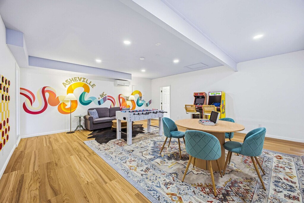 Feel at home in this 6-bedroom, 5-bathroom home nestled on a rolling hill in the scenic Riceville Community of East Asheville, comfortably accommodating up to 20 guests. This stunning retreat offers panoramic mountain views and charming neighboring pastures with barns and livestock, just minutes from downtown Asheville. This home is jam-packed with amenities, including a sport court, private pool, hot tub, sauna, game room with arcade games, tic tac toe, checkers wall game, pool and poker table, outdoor patio/dining, BBQ grill, propane fire pit, putt putt, corn hole, giant connect 4, kids playground, fully stocked kitchen, outdoor bar, dedicated workspace, and family/kid-friendly features. Inside, gather around the cozy fireplace, unwind in the sun-filled great room, or enjoy added flexibility and privacy with a fully equipped Mother-in-Law suite. The suite is attached to the main house through the game room and features two bedrooms, one hallway bathroom, a full kitchen, and a comfortable living area with a sleeper sofa. Parking is available for 8 vehicles in the driveway; street parking is not allowed. Adventure awaits nearby with easy access to hiking trails, picnics, and the scenic Blue Ridge Parkway. When you’re ready for city life, explore Asheville’s vibrant arts scene, diverse music venues, top-tier dining, and boutique shopping, all just a short drive away. Nearby attractions include the Biltmore Estate (~9 miles), Blue Ridge Parkway Entrance & Scenic Drives (~8–12 miles), The North Carolina Arboretum (~10 miles), Western North Carolina Nature Center (~12 miles), and Asheville Botanical Garden (~11 miles). For dining, Tupelo Honey Southern Kitchen & Bar, Chestnut, The Corner Kitchen, Cúrate Bar de Tapas, and Vinnie’s Neighborhood Italian South are all approximately 11 miles away. No pets and no parties are allowed; violations may result in immediate termination of the stay. An exterior camera is installed solely to monitor the cleaning team for quality and security purposes. Guests must be 21 years or older to book this property. Check-in is at 4pm and check-out is at 10am. [SI]