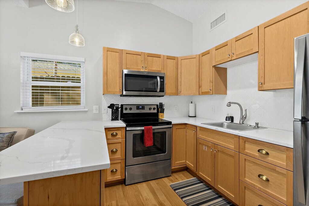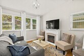 Located within the historic Fullerwood neighborhood in Uptown St. Augustine, this charming guest house is perfect for couples, families, or small groups. Inside, you will find spacious living, a modern kitchen, a king bedroom with a workspace and an en-suite bathroom, while outside, there is a patio with alfresco dining, a grill, a fire pit, and coveted off-street parking. Take advantage of the coveted parking and step inside this cozy, well-appointed guest house featuring bright, open living with soft, comfortable furnishings and stylish décor. Relax in the provincial-style living area with a plush sofa surrounding the warm, inviting fireplace and big screen smart TV, perfect for a movie night in. The sofa also converts into a comfortable sofa bed for an additional two guests. Overlooking the lounge, the kitchen comes fully equipped with everything you need for your stay, including a full-size fridge/freezer, a freestanding oven and cooktop, a built-in microwave, and a coffee maker. Sit up at the sleek island breakfast bar with seating for two or enjoy alfresco dining in your patio area with a grill, plenty of outdoor seating, and a propane fire pit. The spacious bedroom features a luxuriously large king bed topped with soft, quality linen, a built-in office nook by the window, a closet, and a Smart TV. The sparkling en-suite bathroom offers a relaxing full-size bath, overhead shower, and a vanity stocked with essentials. Guests can also use the laundry/dryer set in the en-suite along with plenty of soft, fluffy towels and some beach equipment. The property offers coveted off-street parking for guests. Ride along the serene tree-lined streets and into town to see all the historic sights at your own pace. Within walking distance from the guest house are great coffee shops and restaurants, including DOS Coffee and Drake's Deli. A short drive takes you to the beautiful Vilano Beach to soak up the sun. This top location is right in the heart of the historic Fullerwood neighborhood of Uptown St. Augustine and is only a short 5-minute drive into the city center with its abundance of restaurants, bars, and boutique shopping. Quiet hours are between 10 p.m. and 8 a.m. per St. Johns County ordinance and are enforced. The minimum age to book is 25, and the primary guest must be present for the duration of the stay. No parties are allowed, and any guests visiting outside of the reservation must be approved by hosts prior to their arrival. The home has an actively recording security camera installed at the front door. An attempt to remove, tamper, or disconnect the internet to Ring may result in reservation being canceled and guests requested to vacate the premises. No pets are allowed on the property at any time. No vaping or smoking is allowed on the property, including the front porch. If evidence of smoking is found, you will be subject to an additional cleaning fee. Late check-outs and early check-ins are not allowed without prior approval, and guests who stay past checkout time will be charged an additional fee of $50 per hour. Illegal drugs, including marijuana, are strictly prohibited. Parents with younger children use the home at their own risk as it is not child-proofed. The bedroom includes a built-in office nook by the window for catching up on any work or study.