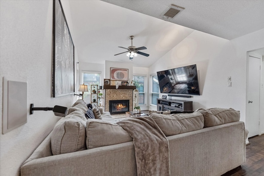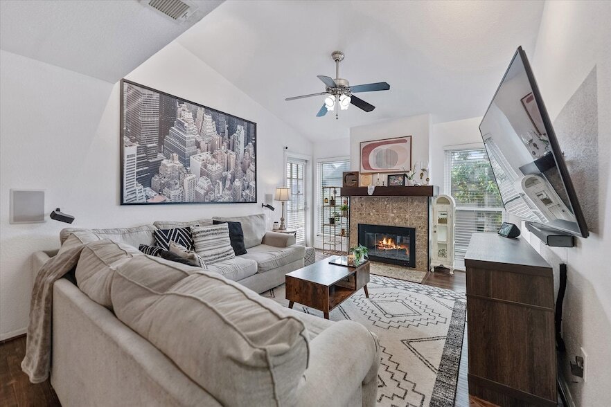 Welcome to this beautifully maintained and renovated 2-bedroom, 2-bath condo perfectly situated just minutes from the Galleria, major freeways, and the YMCA. Step inside to find laminate wood flooring creating a warm and cohesive feel. The inviting living room features a cozy wood-burning fireplace with a custom mantel and direct access to your private balcony perfect for relaxing or entertaining. The charming breakfast/dining area showcases an accent brick wall that flows seamlessly into the living space, creating an open-concept layout. The kitchen features granite countertops and offers plenty of space for meal prep and storage. The spacious primary suite includes two walk-in closets and an en-suite bath with dual sinks for added convenience. This condo also features an attached 2-car garage with private entry and bonus attic storage rare for this type of property with several recent building system upgrades. Located in a prime location!