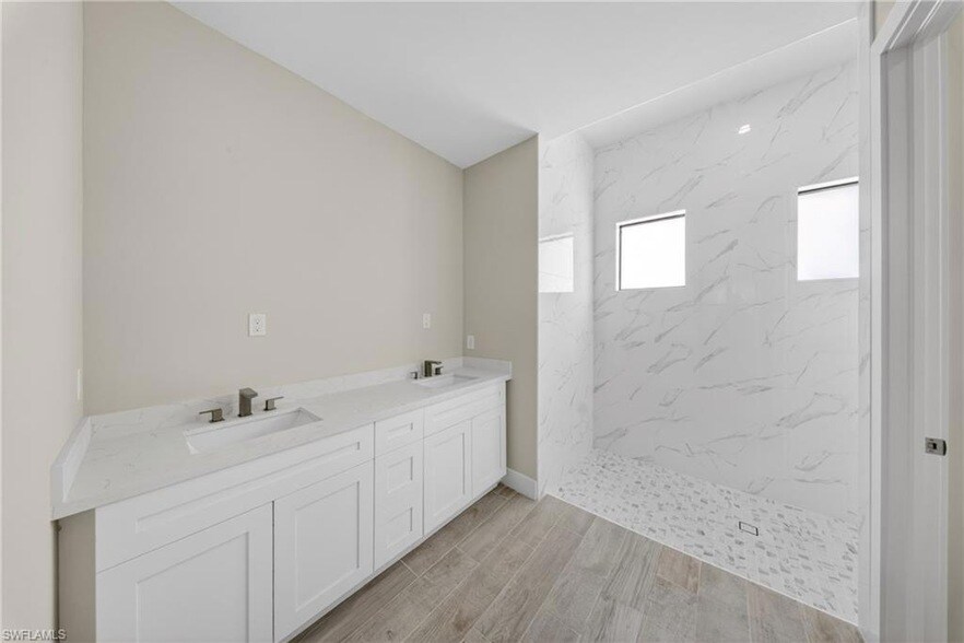 Brand new construction pool home situated on a spacious oversized lot in a quiet area of Lehigh Acres. This 4-bedroom, 3-bath residence features a modern open-concept layout with high tray and volume ceilings, wood-look tile flooring throughout, and abundant natural light. The kitchen is equipped with quartz countertops, a large island, white shaker cabinets, and stainless steel appliances, perfect for both everyday living and entertaining. The primary suite offers dual vanities and a beautifully designed walk-in shower with floor-to-ceiling tile. Enjoy Florida living at its best with a screened-in lanai and private pool, ideal for relaxing or hosting. Conveniently located with easy access to major roadways, shopping, and dining while still offering privacy and space. for maintenance and lawn care not included please contact agent for more information.