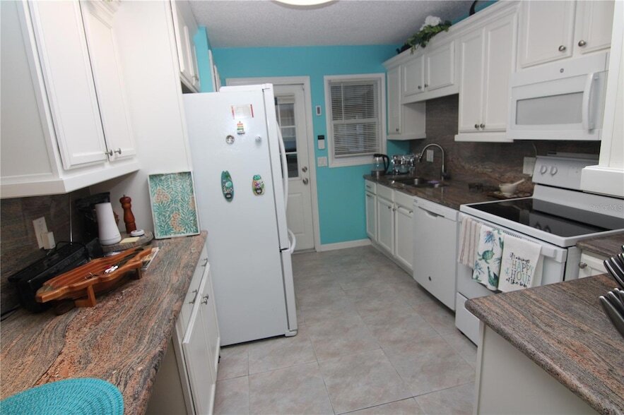 Don't pass up this gorgeous furnished condo in Sun City Center with expansive views of water and golf course! This spotless home is ready for immediate occupancy. Pull-out drawers, granite countertops, under-cabinet lighting, a French door refrigerator with a bottom freezer, a built-in microwave, a new glass top stove (2023), a dishwasher, and a handy breakfast bar peninsula are all elements of the updated kitchen. An updated shower, vanity, fixtures, and linen pantry are features of the primary bedroom's en suite bathroom. A stylish upgrade has also been made to the guest bathroom. Two bedrooms, a living room, dining room, family room, and a Florida Room with stunning views is included in this floor plan. The utility area has additional storage and air conditioning and is enclosed independently.
