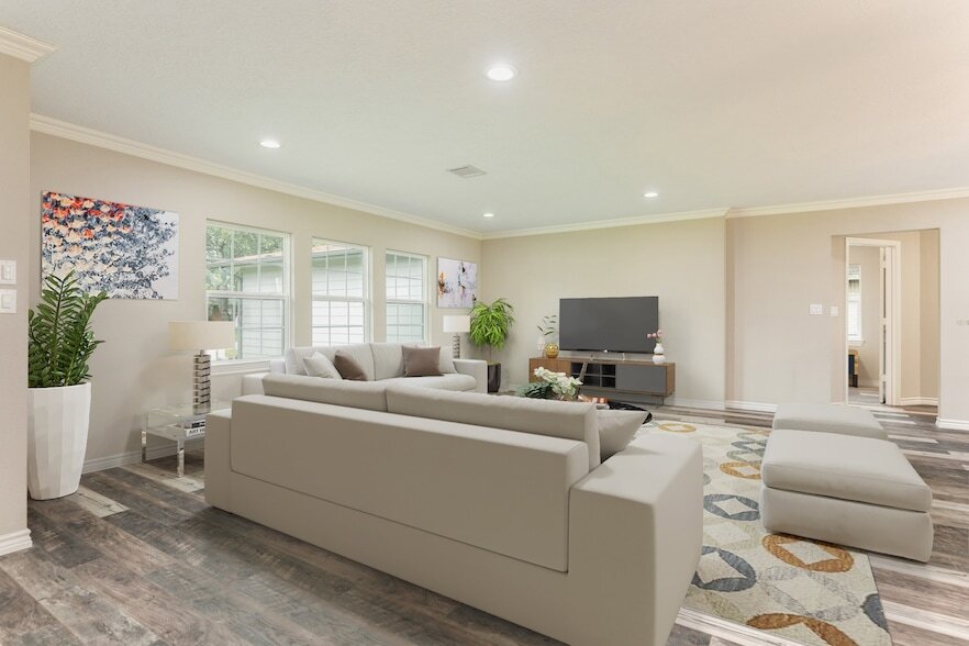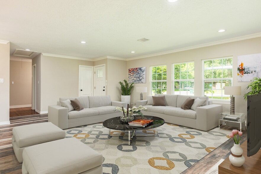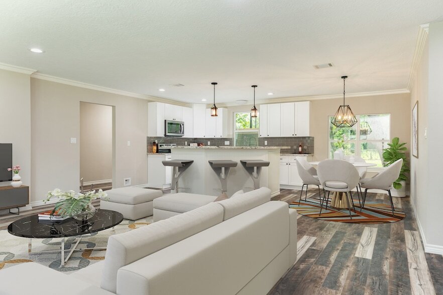 Beautifully renovated, charming 4 bed, 2.5 bath with a spacious backyard with no back neighbors. Freshly repainted 2026. Shaker cabinets, granite in the kitchen, quartz in the baths, stainless steel appliances, glass tile backsplash, updated light fixtures and hardware throughout, porcelain-tiled shower surrounds with marble accents ... absolutely charming! Wood floors in the secondary bedrooms, and gorgeous water-resistant laminate floors through the rest of the living space, tile in the baths. NO CARPET. Refrigerator can be provided - ask for details. Cul-de-sac street. Step into your back yard for a true country feel. Come view today!