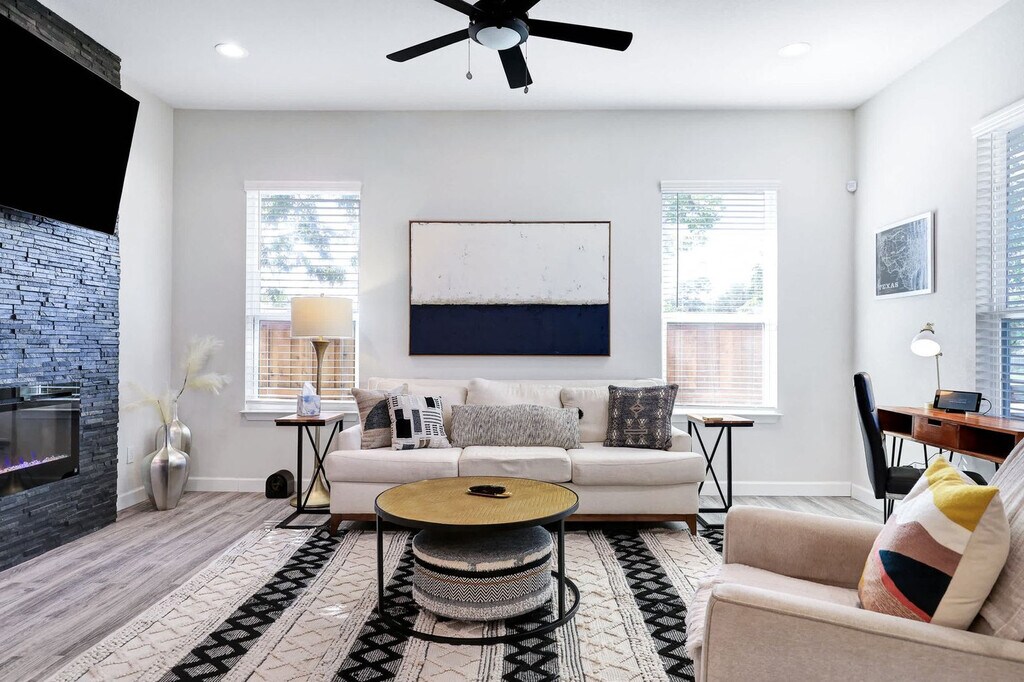Feel at home in this spacious and stylish 3-bedroom home in a prime San Antonio location. Designed to comfortably accommodate up to 8 guests, this home offers a perfect balance of comfort, convenience, and modern amenities. The open-concept living area is perfect for gathering, featuring cozy seating and plenty of natural light. The fully equipped chef’s kitchen includes high-end appliances, ample cabinetry, a large refrigerator, a large island with high seating, and a Keurig coffee maker. Enjoy the outdoor covered patio with a gas grill and a fully fenced-in yard. The home also features an indoor fireplace and a games corner with board and card games. Located in the heart of San Antonio, this home puts you close to vibrant local attractions, dining, entertainment, and cultural landmarks. The neighborhood offers a unique mix of urban energy, historic charm, and easy access to the city’s top attractions. The San Antonio River Walk is approximately 1.2–1.5 miles away, and Boudro's Texas Bistro is about 1.2 miles away. Pets are not allowed. No parties are allowed—violations may result in immediate termination of the stay. Guests must be 21 years or older to book this property. Check-in is at 4 pm, and check-out is at 10 am. Parking is available in the driveway for a maximum of 3 cars; street parking is also allowed. Includes a dedicated workspace in the living room. Registration Number: STR-24-13500767 [SI]