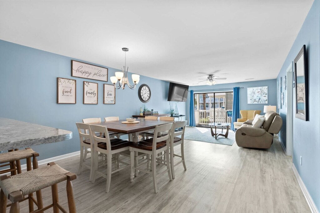 Whether you know Surfside Beach or not, you will realize this 3-bedroom, 2.5-bathroom ocean view condo is a showstopper. Ditch the tired 80's condo you are used to and spend your vacation in style in this beautifully updated and modern 1300 sq. ft. property with private garage parking for two full vehicles underneath. Located between 12th and 13th Avenues South, you will be in perfect position to check out the brand new Surfside Pier with all of the delicious eateries around it close by. Or, if you are in the mood for something a little more high brow, pack up the family and head for the Murrells Inlet Marsh walk. Located all on one level on the second floor, there are two private entrances to this 3-bedroom, 2.5-bathroom condo. As you enter through the main door, you will be swept into the open plan and very spacious living, kitchen, and dining space with seating at the table for a comfortable six and four additional bar stools at the kitchen peninsula. Speaking of the kitchen, it's fully stocked with all modern appliances, granite and stone countertops, and plenty of space to store your provisions. There is a third bedroom with two twin beds as well as an additional roll-out cot if ever needed. Next door is bedroom #2 with a king bed and twin day bed and a private half bath located inside this room. Just adjacent to these two bedrooms is a large hallway bathroom with a tub/shower combo. Located right off the living room is the huge Master Suite with a private en-suite bathroom with large shower and double vanities. The suite contains a king bed, nice-sized closet, and 40" flat screen TV and has ocean views from bed. To make your stay even more enjoyable and hassle-free, we offer some optional super light, durable backpack style beach chairs as well as our custom golf carts which are rentable on your Guest Portal provided at the time of booking. Between 12th and 13th Avenues South in Surfside, you are in a perfect position not only because you are right on the ocean, but because you can be at fabulous restaurants as well as shopping within 5-10 minutes. Check-in is from 4:00-10:00 PM and check-out is at 10:00 AM. The property is non-smoking and pets are not permitted. By state law, occupancy may not exceed eight, including infants and children. Quiet hours are between 11:00 PM and 7:00 AM as per city ordinance. Please consider your neighbors and keep noise at a reasonable sound level. [SI]
