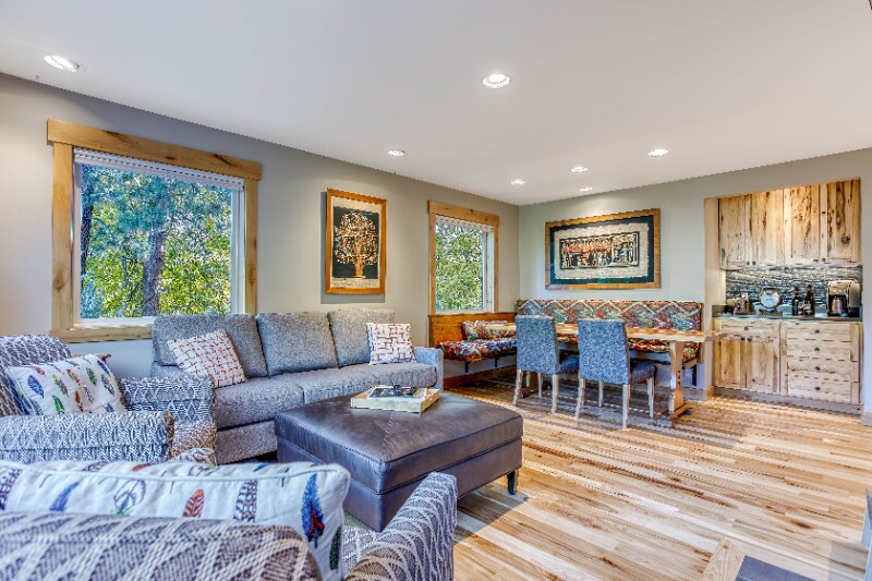 Property Id: 2218747 Experience the best of Leavenworth from this luxury riverside retreat steps from downtown Leavenworth. Enjoy a private heated pool (summer only), mountain views, and the Waterfront Park. Inside, modern comforts with four bedrooms, three baths, an open living area with a wood-burning fireplace, gourmet kitchen, movie room, office, fiber internet, heated driveway, and heated garage. Relax by the firepit, grill, or follow a hidden trail to the river. Year-round adventure in downtown Leavenworth. - Open living area w/ fireplace & large-screen TV - Chef's kitchen w/ high-end appliances and quartz counters - 4 bedrooms / 3 bathrooms w/ heated tile floors and rain showers - 4th bedroom - dedicated office with sit/stand desks, dual monitors - Primary suite with private bath and deck - Movie room for family nights - Heated garage + driveway - Ski & bike racks, boot dryers - IGB Fiber Internet - EV charger - Central heat & A/C Rent-to-income ratio, credit score, and background check required.