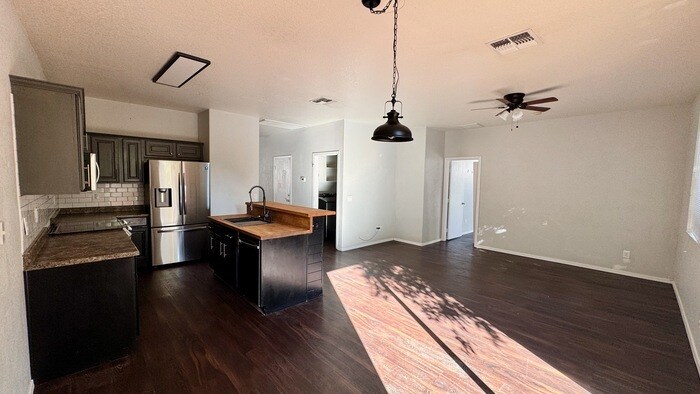 Welcome to this beautifully updated home offering modern style, comfort, and functionality. Featuring 3 bedrooms and 2.5 bathrooms, this property is designed with thoughtful finishes and an inviting aesthetic throughout. Step inside to enjoy all wood floors, providing warmth, durability, and a clean, cohesive look. At the heart of the home is a large open-concept kitchen boasting a gorgeous butcher block countertop and striking black cabinetry, creating a stylish and contemporary cooking and gathering space. The home also includes a brand-new AC unit, ensuring efficient cooling and year-round comfort. Outside, the private backyard offers the perfect place to relax, entertain, or enjoy Arizona’s sunny weather. Located in a welcoming community with parks and playgrounds, this home offers convenient access to outdoor recreation, making it ideal for everyday living. This property allows self guided viewing without an appointment. Contact for details.