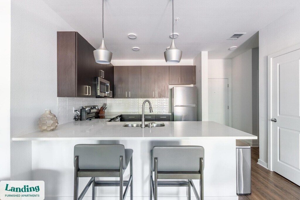 Landing offers flexible lease terms from weeks to months. Please always visit our website or contact us for the latest pricing & availability. Stay longer, save more: 6-Month Minimum base rent: starts at $2670/mo 12-Month Minimum base rent: starts at $2220/mo Landing offers flexible leases across a network of over 35,000 fully-furnished apartments throughout 375+ cities so you can rent on your terms, practically anywhere, and avoid the hassle of paying deposits or application fees. Visit to learn about all the benefits of a Landing membership, see our competitive up-to-date pricing, explore available apartments, take virtual tours, and make reservations online without jumping through traditional rental hoops. Landing's apartments at Solaris at Kissimmee are designed for comfortable, easy living, with the ability to stay as long as you like. Experience living with Landing Every apartment is outfitted with all the modern essentials including: custom-designed furnishings, a fully-equipped kitchen with deluxe stainless steel appliances, a gourmet coffee maker, premium linens, Smart TVs, and incredibly fast, reliable internet for working from home. When you live with Landing, you'll enjoy a hassle-free experience with the added benefit of 24/7 access to our dedicated member experience team. Some of the nitty-gritty: a background check and proof of income are required; we're completely smoke-free; bundled utility packages and pricing vary based on length of stay; pet-friendly options available; listed price reflects a 12-month minimum stay.