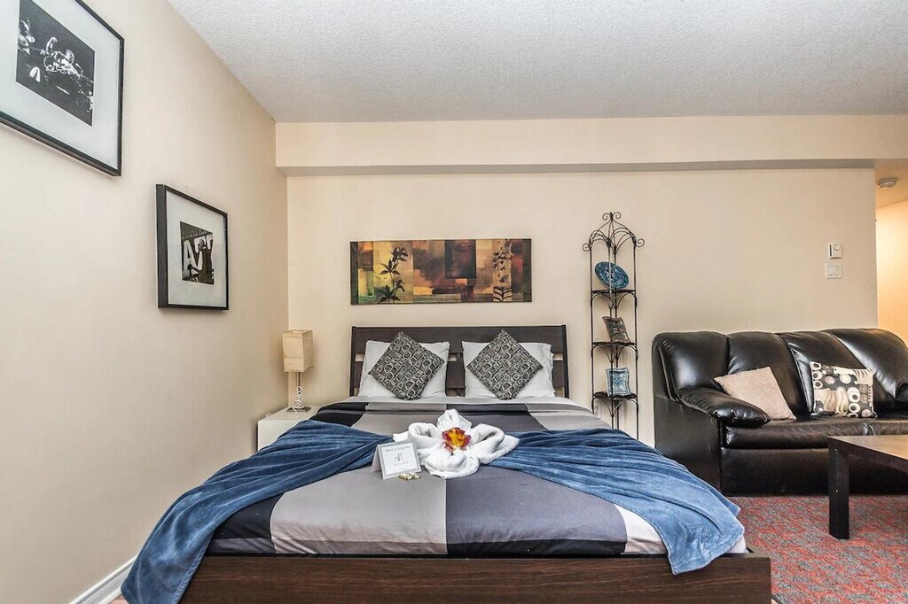 In the heart of Montreal's vibrant streets, this apartment stands as a sanctuary, a haven veiled from the city's frenetic pace. Behind the elegant facade of the hotel that shares its name, lies a community that thrives on exclusivity and luxury. Residents enjoy a lifestyle where tranquility intertwines seamlessly with urban convenience and desire is within reach, just a stone's throw away from the serene enclave they call home. This studio apartment welcomes you with a queen bed and a full bathroom, offering a cozy retreat for two guests. After visiting some exceptional apartments ourselves, we've strived to make this apartment as welcoming and cozy as possible for our guests. Enjoy a Smart TV for your viewing pleasure and stay seamlessly connected with high-speed Wi-Fi throughout your stay. Indoor parking with in/out privileges is available for an additional fee, depending on your length of stay. We also offer a variety of cleaning services, including bi-weekly or monthly options, for an extra charge. Located in the heart of Montreal, this apartment offers urban convenience with tranquility. The vibrant streets provide easy access to the city's attractions, dining, and entertainment, all within a short distance from your serene enclave. No parties of any kind or loud noises that can alter the harmony of residents are allowed. Smoking of any kind, including cannabis and cigarettes, is prohibited inside the apartment, balcony, or the building. Please care about your home away from home. Includes high-speed Wi-Fi for seamless connectivity.