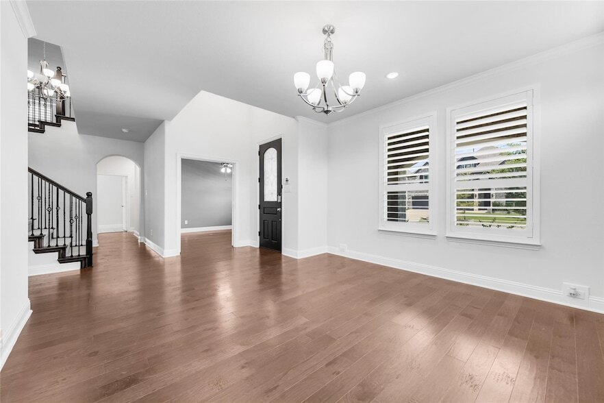 A North-facing striking blend of modern design and timeless warmth. Soaring ceilings, warm wood flooring, and wrought iron staircase railings set a dramatic tone in this beautifully crafted residence. The open-concept layout connects a generously sized kitchen with an inviting living area, complete with an eat-in breakfast nook, spacious island, and a butler s pantry that leads to a formal dining room framed by deep-set windows perfect for statement decor or cozy window seating. For added luxury the home has a whole house water softer and custom accent walls in select bedrooms. The primary suite is a serene retreat featuring tray ceilings, extra space for a sitting area, and a spa-like bathroom with dual vanities, a corner soaking tub, a separate shower, and abundant storage. A secondary bedroom is conveniently located downstairs with its own oversized window seat. The office area, which can be used as a 3rd downstairs bedroom, has beautiful French doors and light and bright walls. While upstairs offers two additional bedrooms, a large game room & media room, and all bedrooms have elegant plantation shutters.Outside, the home impresses with eye-catching curb appeal light stone and brick accented by dark details, manicured stone flower beds, a welcoming front patio, and a charming upper balcony that adds both function and flair.