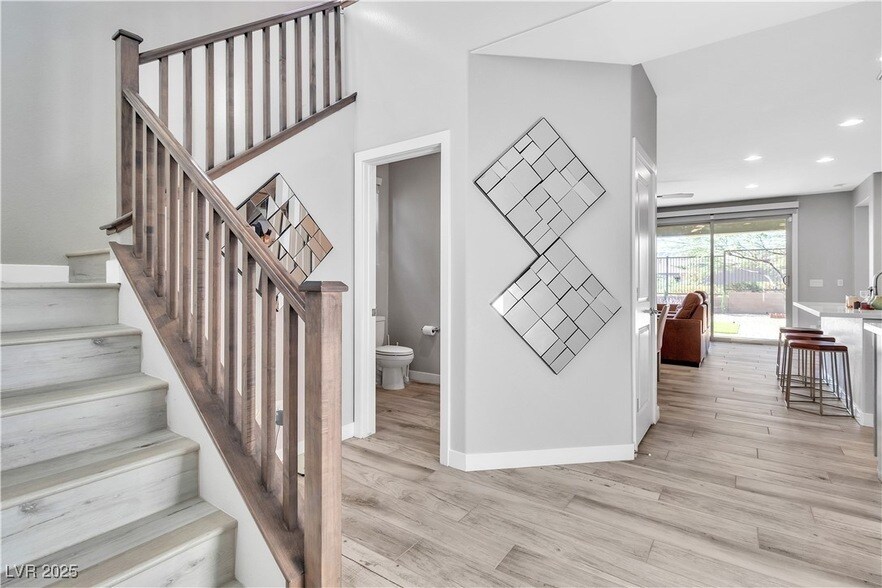Move-in ready, this beautiful home offers stunning Red Rock Canyon mountain views and a panoramic Las Vegas city view. The main bedroom and bathroom are conveniently located on the first floor. Enjoy easy access to nearby walking trails. The home features a 12-foot stackable sliding glass door and an extended, upgraded primary shower. The kitchen is equipped with upgraded maple 'Dusk' cabinets, enhanced hardware, and stainless steel appliances, including a built-in oven and microwave. Ideally located just 10 minutes from the 215 freeway, Downtown Summerlin, Red Rock Hotel, and Las Vegas Ballpark.