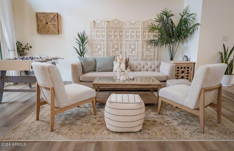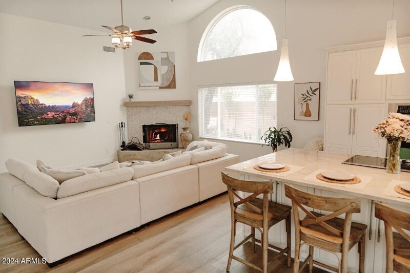 Property Id: 1405705 Welcome to Tres Palmeros — a beautifully renovated 4-bed, 2.5-bath home on a 1/3-acre lot near the Cactus Corridor, perfectly situated between Old Town Scottsdale and Kierland Commons. Fully or partially furnished with long to mid-term lease options available. The great room features soaring 24-ft ceilings and opens to a resort-style backyard with pergola, daybed, pool, spa, putting green, and BBQ. Dining and living areas include a fireplace, wet bar, and seating for eight. The updated kitchen boasts custom cabinetry, granite counters, a 9-ft island, stainless appliances, and a second fireplace. The primary suite offers 17-ft ceilings, walk-in closet, backyard views, and a spa-like bath. Three large guest bedrooms share an updated hall bath with outdoor access. Additional highlights include a 3-car garage, large laundry room, Nest thermostats, Samsung TVs, Sonos soundbar, and designer furnishings from Pottery Barn and Z Gallerie.