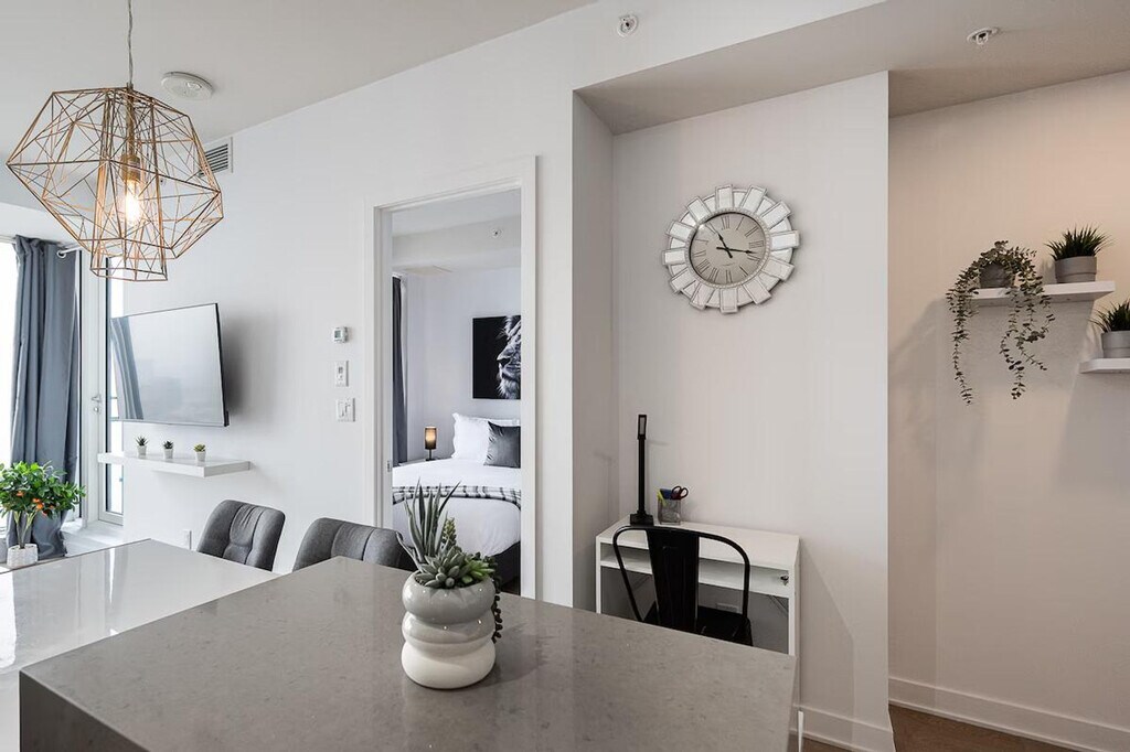 The advertised rate of C$4,322/month is the lowest available price, based on a 30 day(s) stay with a move-in date of July 5, 2026. Rates vary depending on the duration of stay, season, and other parameters. For exact pricing and additional pricing components, please visit our website and enter your desired move-in and move-out dates. The rate is applicable when billed upfront; it can be higher if billed in multiple payments. Welcome to Tour des Canadiens 2 and feel at home in this newly renovated 660 sq. ft. furnished condo. This apartment accommodates 4 guests and features a private balcony, a glass shower, high-end appliances, and an in-suite washer and dryer. Enjoy a Smart TV and stay seamlessly connected with high-speed Wi-Fi throughout your stay. Indoor parking with in/out privileges is available for a separate fee depending on your length of stay. A variety of cleaning services, including biweekly or monthly options, are offered for an extra charge; please contact us for more information. The apartment is steps away from Bonaventure and Lucien L’Allier metro stations, trains, and Montreal’s underground network. No parties of any kind or loud noises that can alter the harmony of residents are allowed. Smoking (including cannabis/cigarettes or any kind) is prohibited inside the apartment, balcony, or the building. Enjoy the fantastic terrace with BBQ grills, indoor swimming pool, sauna and jacuzzi, fitness center, entertainment room with pool table, bar and cellar, and 24/7 security desk. [SI]