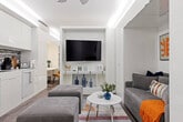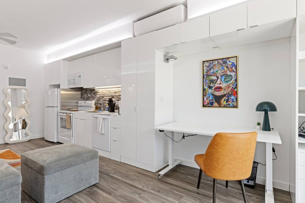 Feel at home in this modern studio apartment in the heart of University Circle. Located on the 3rd floor with stairs only (no elevator), this stylish apartment is the perfect city escape. This apartment features a fully equipped kitchen with a coffee maker, kettle, olive oil, salt, pepper, sugar, pots, pans, cutlery, dishes, microwave, toaster, oven, stove, fridge, and dishwasher with detergent. Included essentials are shampoo, conditioner, body wash, towels, linens, a hair dryer, an iron, an ironing board, a washer/dryer with laundry supplies, room-darkening shades, a 50" smart TV, and high-speed Wi-Fi. Free private parking is available (Spot #27). Walk, bike, bus, or drive to top spots such as University Circle and Cleveland Clinic (8 min), Little Italy (shops and eateries) (10 min), and Downtown, Rocket Mortgage FieldHouse, Progressive Field, and Browns Stadium (12 min). The apartment is near Shaker Square, a historic shopping district in Cleveland, Ohio, known for its eclectic charm and vibrant atmosphere. It's a 5-minute walk from the nearest Rapid train line (Shaker Square Station on the Waterfront line) and bus line (Shaker Square on bus 48). Quiet hours are from 10 PM to 8 AM. Smoking indoors is prohibited and will incur a $500 fine. Pets are not allowed and will incur a $500 fine for unregistered pets. Unauthorized events will result in a $1,000 fine and removal without refund. Only registered guests are allowed, and undeclared guests will incur a $350 fine per night. There is a security camera located outside the unit door, and covering or disabling it will incur a $500 fine. Check-out is by 10:00 AM, and a late fee of $50/hour will be charged after 11 AM. A noise-aware sensor is installed in the unit to monitor decibel levels. Includes a dedicated workspace. Multiple units are available in the building, and décor/layout may vary. Guests are responsible for replenishing their own consumables after the initial supply is depleted. [SI]