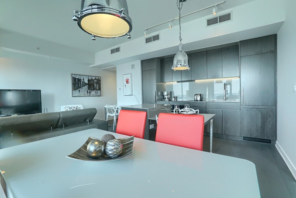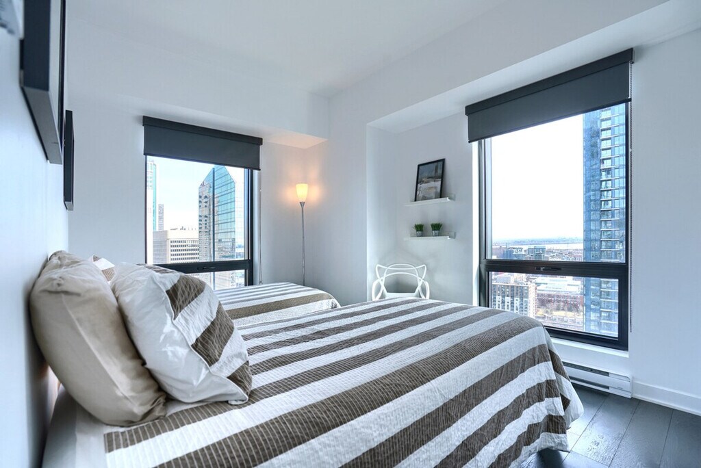 Welcome to a luxurious high-rise in downtown Montreal offering breathtaking city views. Indulge in a spacious unit with two bedrooms, two full baths, a private balcony, and expansive 10-foot ceilings that invite natural light through large, sunny windows. This property boasts high-end finishes throughout, coupled with a suite of top-tier amenities. Conveniently located mere steps from Lucien l’Allier metro station, train access, and the underground Montreal network. After visiting some exceptional apartments ourselves, we've strived to make this apartment as welcoming and cozy as we possibly could for our guests. This space welcomes four guests. It has two bedrooms with two queen beds and two full bathrooms. Enjoy a smart TV for your viewing pleasure and stay seamlessly connected with high-speed Wi-Fi throughout your stay. Indoor parking with in/out privileges is available for an additional fee depending on your length of stay. We offer a variety of cleaning services that include biweekly or monthly options for an extra charge. Built in 2016, this apartment is in the heart of downtown Montreal with security 24/7. Enjoy a fantastic terrace with a swimming pool and BBQ grills, a fitness center, a sauna and rain room, and many entertainment rooms. Just steps away from the Lucien l’Allier metro station, train, and the underground Montreal network. No parties of any kind or loud noises that can alter the harmony of residents are allowed. No smoking of cannabis, cigarettes, or any kind inside the apartment, balcony, or the building. Please care about your home away from home.