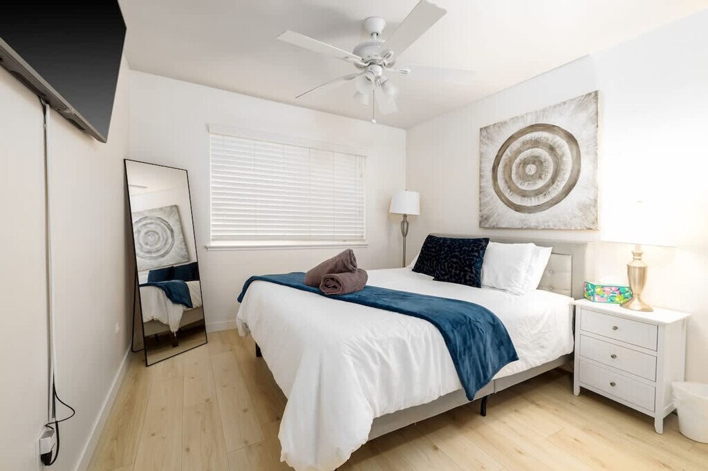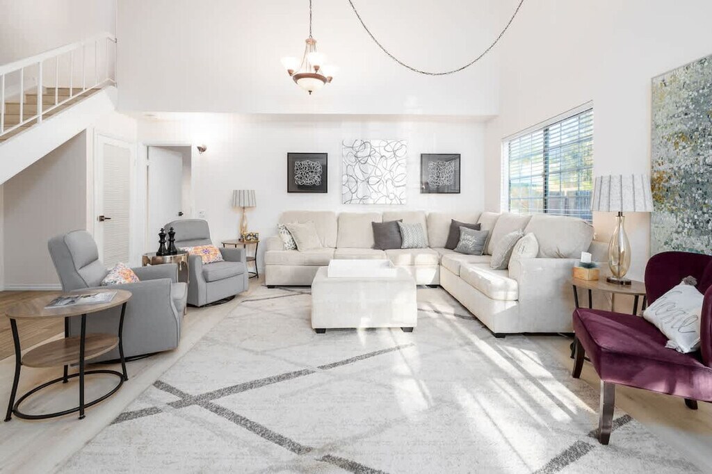 Feel at home in this spacious 5-bedroom home located in a quiet cul-de-sac in Poway/Rancho Bernardo, San Diego. With three bathrooms, this home is perfect for families or groups of friends. This home features an amazing living room with a vaulted ceiling, a massive new couch, and a 75' TV. The fully equipped kitchen includes brand new appliances and a whole home water filtration system. Enjoy the NBA arcade game, Pac-Man arcade, indoor and outdoor fireplaces, and a large backyard with patio furniture, a barbecue, and an outdoor TV. A coffee machine and coffee are provided. The backyard is fully fenced, making it perfect for kids and pets. On-site free parking is available. A Graco 'Pack 'N Play' and kids' toys are provided. Tucked away in a peaceful, safe neighborhood, this home is just a stone's throw from amazing golf courses and picturesque vineyards. It's the ultimate spot to unwind after a day of adventures. This home is very family friendly. [SI]