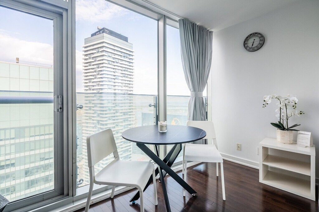 Located in the core of downtown on the 52nd floor, feel at home in this beautiful suite with a lake view. This comfortable suite has everything you need to make you feel right at home, including a fully functional kitchen with supplies such as tea, coffee, a kettle, coffeemaker, and toaster. Enjoy entertainment with the smart TV, Netflix, and Wi-Fi. A bathroom with towels, shampoo, conditioner, body wash, a hair dryer, and other toiletries are provided. There is also a washer and dryer with supplies. Paid underground parking with in/out privileges is available upon request for $20 per night ($10 per night for bookings of at least 20 nights). Please request parking in advance as it could be booked. Pets are allowed for a fee of $20 per night for one pet. Travel cribs (for 0-18-month-old babies) and bed rails are available for $10 per item per night; please book them in advance. Walking distance to the Scotia Bank Arena, Union Station, Rogers Center, CN Tower, Ripley's Aquarium, Financial District, and hundreds of restaurants and bars. It's also close to the Eaton Centre and Queen Street fashion district, with easy access to the Subway and GO station. A grocery store, liquor store, banks, and all other necessities are within walking distance. Guests must be 25 or over in order to check in, but for reservations with 7 nights or more, it is possible to check-in from the age of 18. According to the condo rules, information about guests must be provided to the condo management prior to their arrival, including every guest's name and ID details, vehicle and license plate numbers (if parking is required). Guests whose names or ID do not match the information given are not allowed into the building. The unit entrance is equipped with a smart lock which makes the check-in/check-out process super easy. Registration Number: STR-2306-GTGDVV [SI]