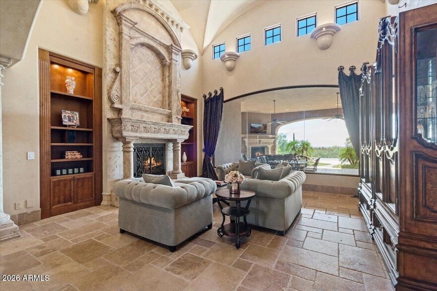 Experience luxury desert living in this stunning Tuscan-style custom home tucked away on a quiet cul-de-sac in Scottsdale. The south-facing backyard opens to natural open space & showcases breathtaking city lights & desert views, creating the perfect setting for both relaxation & entertaining. A large, private gated front courtyard welcomes you w/a charming outdoor fireplace & generous sitting area. Just off the courtyard is a separate casita w/kitchenette, ideal for guests, extended family, or a private workspace. Inside the main home, you'll find an elegant formal living room & dining area, along w/a warm & inviting family room w/a bar & fireplace. The spacious chef's kitchen is designed for gathering, featuring a large island, abundant cabinetry & a bright breakfast nook area. The home offers spacious bedrooms, a large private office, and a lower-level game room perfect for entertainment or recreation. Cozy fireplaces enhance the primary bedroom, living room, and family room, adding warmth and character throughout. Step outside to enjoy resort-style amenities including a private pool & spa & a backyard outdoor fireplace, all set against beautiful open-space views and sparkling city lights. Additional highlights include smart home technology, an electric vehicle charger, and a rare 4-car garage with ample storage. This exceptional rental combines privacy, views, and sophisticated indoor-outdoor living in one of Scottsdale's most desirable settings.