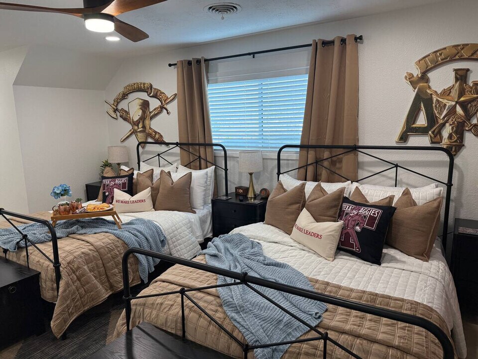 The advertised rate of $15,750/month is the lowest available price, based on a 30 day(s) stay with a move-in date of March 16, 2026. Rates vary depending on the duration of stay, season, and other parameters. For exact pricing and additional pricing components, please visit our website and enter your desired move-in and move-out dates. The rate is applicable when billed upfront; it can be higher if billed in multiple payments. Feel at home in this fully themed retreat designed for fans of the greatest university on the planet. Located less than 2 miles from campus, this apartment blends bold design, comfort, and unforgettable gathering spaces all under one roof. Perfect for families, alumni, and future Aggies alike. Each bedroom is thoughtfully styled with statement murals and curated décor that honor the spirit of College Station. Gather in the open-concept living area with plush seating, a statement fireplace, and a large TV ready for kickoff. Enjoy the pool table, dinner around the spacious dining table, relax by the fire pit, or soak up the nostalgia in the Dixie Chicken-inspired garage bar. Welcome to your ultimate Aggieland getaway, where game day energy meets elevated comfort. Whether you're here for football weekends, graduation, ring dunk, or a campus tour, this stay delivers comfort, style, and unmistakable Aggie spirit. [SI]