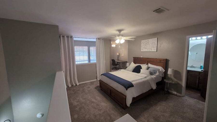 Newly renovated, fully furnished condo near Texas A&M University and health care centers. The downstairs consists of a full kitchen, living room, garage, laundry, and half bathroom. The upstairs consists of a bedroom with queen size Purple mattress, walk-in closet, full bathroom, office, and outdoor patio. Appliances include a new fridge/freezer, new dishwasher, coffee maker, toaster, washer and dryer, and an ice maker.