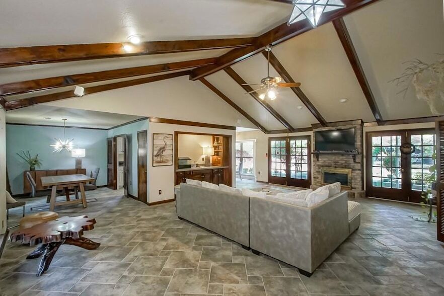 FURNISHED 4 BEDROOM, 2 BATHROOM FOR LEASE!Welcome to Country Club Estates, where timeless charm meets thoughtful updates in this beautifully renovated 4-bedroom, 2-bath home. From the moment you step inside, soaring cathedral ceilings with exposed beams and a spacious family room set the stage for comfortable living and easy entertaining. Double French doors lead to an oversized covered patio perfect for morning coffee, weekend gatherings, or quiet evenings outdoors.The kitchen shines with new stainless steel appliances and a cheerful breakfast nook filled with natural light. Outside, the oversized driveway and detached 2-car rear-loading garage offer plenty of parking and storage.Recent improvements include a refreshed primary ensuite with an oversized shower, fresh interior and exterior paint, and more. The home is wheelchair-accessible and ADA compliant, with a serviced HVAC system.