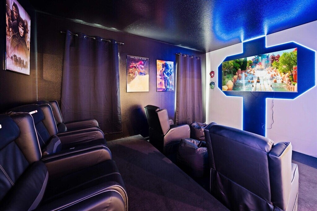 Feel at home in this 9-bedroom resort home that sleeps up to 23 people. This home has beautiful modern furniture and themed spaces. This home includes seven full bathrooms, a private pool and spa, a fully equipped modern kitchen, a full-size washer and dryer, and Wi-Fi. Enjoy access to a family loft and the amenities at the clubhouse. Pool heating is available for $40 a day with a 2-day minimum. A small 18-inch charcoal grill is provided at no cost upon request prior to arrival or the day of arrival before 5 pm. Propane gas grills and other vacation gear are available for an extra cost. Only small pets under 40 pounds are allowed for a $150 pet fee for each animal. Only legal service dogs are exempt with proper documentation. This home is located 6.5 miles from Walt Disney World, 20 miles from Universal Studios, 17 miles from Sea World, 15 miles from the Shopping Outlet, 29 miles from Orlando Airport and 1.5 miles from the Supermarket. The 6,700 sqft Watersong clubhouse is centrally located within the resort and offers a wide range of free-to-use facilities including a fitness center, games room, business center, community pool and spa, children’s play area, and volleyball courts. Washcloths are not provided. Vehicles are limited to garage or driveway space, and there is no street parking. Any damages caused by a pet or extra cleanings will be charged. [SI]