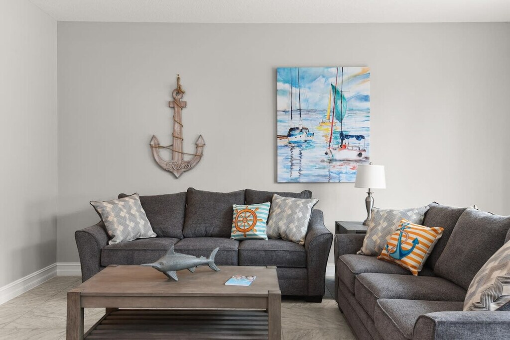 Experience the charm of beach-style décor in this new townhome, offering 2300 square feet of living space. Equipped with smart TVs throughout, it provides ample room for additional guests and air mattresses, making it an excellent home away from home. Enjoy bass fishing on the property's pond or take a short 1/2 mile walk to the beach, with numerous restaurants within walking distance. This spacious family townhouse, furnished with tasteful beach-themed decor, serves as an ideal home base in Indian Harbour Beach. Relax on the private patio or upper balcony and enjoy the coastal breeze. The wide living room features soft sofas and a mounted flat-screen Smart TV, while the brand new fully equipped kitchen boasts a long center island, stainless steel appliances, and quartz countertops, perfect for preparing meals. The upstairs game area offers a Foosball table for entertainment. All three bedrooms are beautifully furnished, with the master bedroom featuring an en-suite bathroom with a walk-in shower. Dogs are welcome at this property with a fee of $100 per pet per stay. Located just a 15-minute walk from Millennium Beach Park and Canova Park, this townhouse offers easy access to shops, cafes, and restaurants along the main street. Guests can enjoy the Fortebello Beachside community pool, complete with loungers and a new pergola and cabana area. The property grounds include paths around a bass fishing pond. Nearby, guests can find jet ski, kayak, and boat rentals. The USSSA Sports Facility is a 25-minute drive away, and the local paddle and oars park and yacht club are must-visit spots. The property is located in a gated community within walking distance of the Atlantic Ocean beaches. Most restaurants and the beach are within walking distance, making cars optional, though Uber or Lyft are available. The pool closes at 10 pm to respect community quiet hours. Mailbox access is not available for guests. The shower in the hallway bathroom has reversed piping, with hot and cold water switched. [SI]