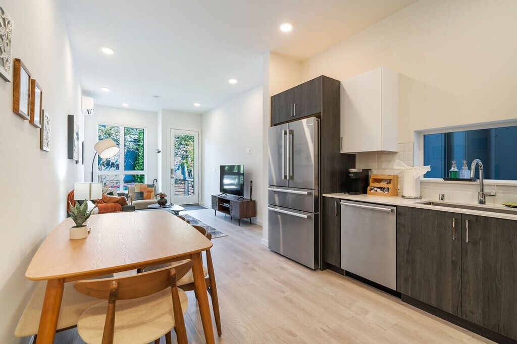 Charming Capitol Hill townhome centrally located with Space Needle view. Walk to shops, restaurants, and transit. City living at its best! This 4-story townhome, including the rooftop, features 3 bedrooms and 2 bathrooms, spanning 1394 sqft. A few steps at the entrance lead you into this inviting space. Enjoy this tastefully decorated and spacious townhome in the heart of Capitol Hill! Stay in, or head up to the private rooftop for a great view of the Seattle skyline, Space Needle, and Mt. Rainier on a good day. The first floor includes a living room, kitchen, and dining area with air conditioning. The second floor houses two bedrooms with queen beds and a hallway bath with a bathtub and shower combo, heated only. The third floor features the primary bedroom with a king-size bed and an ensuite bathroom with a shower, also air-conditioned. The rooftop patio offers comfortable outdoor seating and stunning views. The kitchen is stocked with high-end appliances, cookware, silverware, servingware, spices, and a Keurig coffee and tea maker. High-quality beds, mattresses, pillows, and linens ensure comfortable sleeping. Enjoy the smart TV with Netflix and high-speed internet for streaming or remote work needs. Onsite washer and dryer are available for your laundry needs. Well-trained pets are welcome at $50 per pet. Please let us know if you’ll be bringing your pet and how many. Pet fee beyond one pet is processed manually post reservation confirmation. Paid public parking is available nearby. Pike/Pine Corridor - Capitol Hill: When people think of Capitol Hill, it’s often the Pike/Pine area. It’s an iconic Seattle neighborhood, a prominent hub for food, music, and nightlife. It is also an excellent neighborhood to live in. You’ll find pretty much everything here: Excellent brunch and coffee shops, fantastic dining and shopping, bustling nightlife and award-winning bars, world-class entertainment and live music, enviable transit options, and more! High walkscore and many dining, shopping, and entertainment options are within walking distance. Minutes walk to Capitol Hill Light Rail Station, which takes you to other parts of the town, including the airport. Highly recommending rideshare services! This townhome is not handicap friendly. Guests must be comfortable with stairs as there are multiple stories. Construction on 14th Ave is ongoing from Monday to Friday, 8 AM to 5 PM. Refrain from parking in front of the construction site during these hours. Strictly no parties and events, quiet hours between 10 PM and 8 AM, no smoking or vaping of any kind anywhere on the property including outdoor areas, no digital piracy, and no shoes in the home. A $500 fine per violation applies. Smart TV with Netflix and high-speed internet are available for streaming or remote work needs. A laptop computer is not included. Registration Number: STR-OPLI-22-001361 [SI]