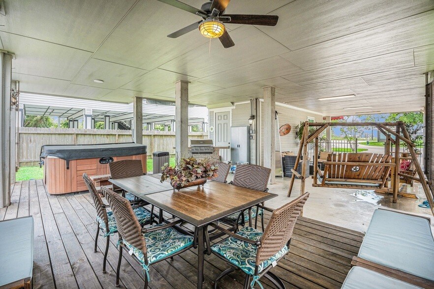 FULLY FURNISHED!!! This custom-built home offers everything you could need, whether you're looking for a long-term rental, a FULL comfortable place to call home in a great school district, or a spacious property with beautiful bayfront views. The home spans four stories, with stunning bayfront views from two large balconies. The ground level provides ample space for parking, storage, a hot tub, above ground pool, an outdoor grill, and entertainment areas. Upstairs, you ll find a spacious family room that opens up to a chef's kitchen, featuring a large walk-in pantry, custom wood cabinetry, stainless steel KitchenAid appliances, granite countertops, breakfast room, formal dining room, and pool room. The primary suite is on the second story which includes two bedrooms with a shared Jack-and-Jill bathroom. The third floor has a bonus game room! Enjoy walking distance to the bay or the shops in old town Seabrook.