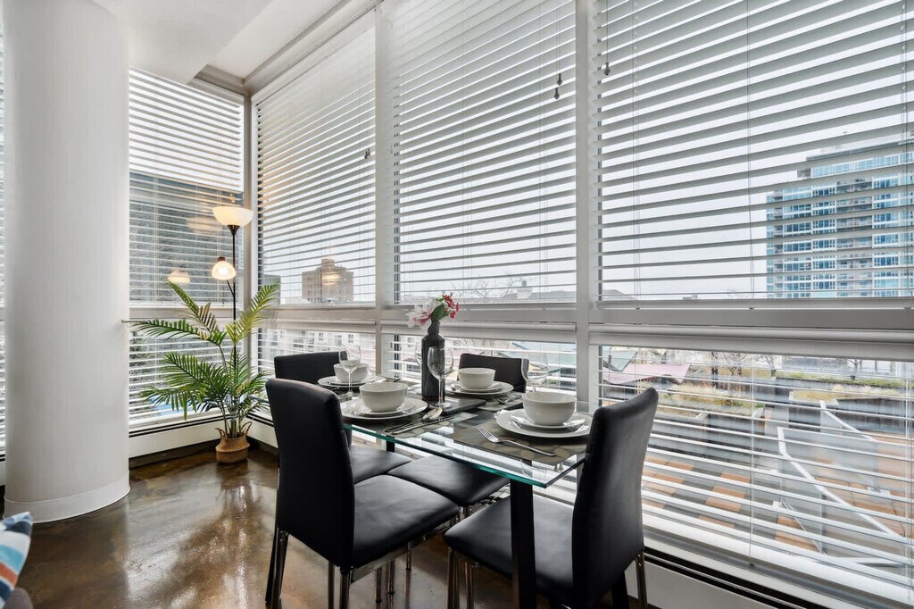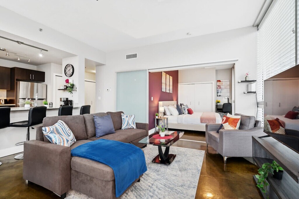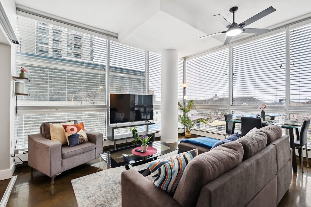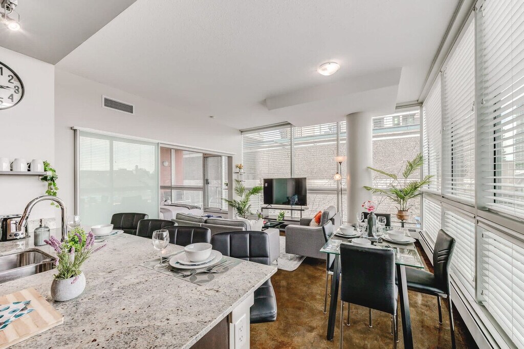 This gorgeous, remote work-friendly 2-bedroom condo is perfect for hosting up to four guests. It features two king-size beds and a fold-out sofa bed in the living room. Enjoy the city views and abundant natural light from the floor-to-ceiling windows. The open-concept design includes a fully equipped kitchen with a dishwasher, in-suite laundry machines, and a dedicated workstation with free Wi-Fi. Located in the Beltline neighborhood, it's within walking distance of Stampede Park. The condo offers two bedrooms with king-size beds and 1.5 bathrooms. The fully equipped kitchen boasts high-end appliances, a dining table with seating for four, and additional dining space for four at the kitchen island bar. Relax in the living room with a 55" smart TV with Netflix and a pull-out sofa bed. The condo also features central air conditioning, in-suite laundry machines, and a private balcony. Secure, gated underground parking is available for an additional fee of $20 per night. Situated in the vibrant Beltline neighborhood, this apartment is just steps away from outdoor tennis courts and public parks, and within walking distance of Stampede Park. You'll be a few blocks from downtown in Calgary's Design District, surrounded by trendy boutiques, eateries, and nightlife. Nearby attractions include the Calgary Tower, Devonian Gardens, and the Calgary Stampede. Keys for the unit must be picked up at an alternate KeyNest location before 10:00 PM. The dishwasher is currently not available for use. Parties, events, and smoking or vaping of any kind are strictly prohibited in or around the property, including common areas. Violations may result in a $150 fine. Pets are strictly not allowed in this short-term rental. Lost or stolen keys will incur a $250 replacement fee. Quiet hours are from 10:00 PM to 9:00 AM. Please check out on time to avoid a $150 fine for each additional hour. The thermostat must not be set below 15°C and should never be turned off. Balcony doors must remain closed in extreme cold weather. The condo includes a dedicated laptop-friendly workstation with high-speed internet service. A laptop computer is not included. Registration Number: BL261385 [SI]