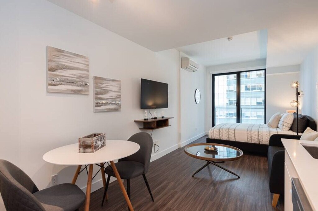 Located in the bustling downtown core of Montreal, adjacent to the Bell Centre, this property epitomizes luxury and practicality, setting a new benchmark for urban living, especially tailored for young professionals, newcomers, and students. Situated mere steps away, you will enjoy easy access to the attractions of the Golden Square Mile and the historic charm of Old Montreal, fostering an environment ideal for both academic pursuits and professional development. This new condo is very well located near the Bell Centre, just steps away from the Golden Square Mile’s attractions. The studio room features a queen bed and a bathroom. The apartment offers a studio room with a queen bed and a bathroom. Indoor parking with in and out privileges is available for an additional fee, depending on your length of stay. A variety of cleaning services, including bi-weekly or monthly, are offered for an extra charge. Situated mere steps away, you will enjoy easy access to the attractions of the Golden Square Mile and the historic charm of Old Montreal, fostering an environment ideal for both academic pursuits and professional development. No parties of any kind or loud noises that can alter the harmony of residents are allowed. No smoking of cannabis, cigarettes, or any kind inside the apartment, balcony, or the building. Please care about your home away from home. Shared workspaces and a conference room are available, along with a workspace offering a view, making it ideal for remote work. [SI]