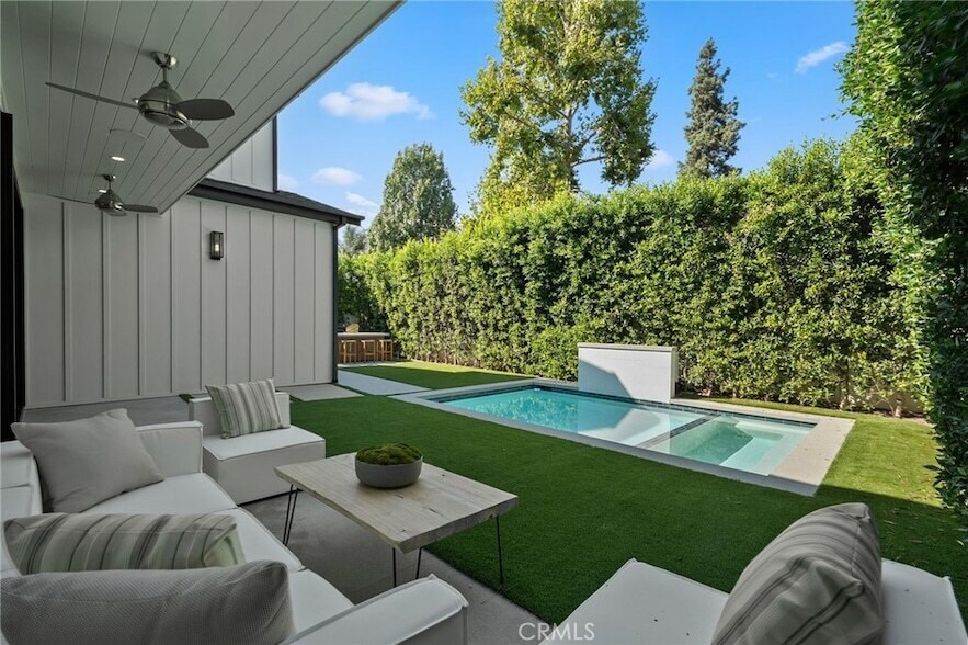 Nestled in the coveted Chandler Estates neighborhood of Sherman Oaks, this newer construction home sits on a gated corner lot, strategically setback from the street to create a private oasis. Designed for modern living, the spacious open-concept main level is anchored by a show-stopping chef s kitchen equipped with top-of-the-line JennAir appliances and a massive island with seating. Floor-to-ceiling sliding glass doors in both the living room and formal dining room open seamlessly to the backyard, effortlessly extending your living space outside. Step outside to a serene retreat surrounded by mature privacy hedges and highlighted by a heated pool/spa, plus a built-in BBQ with bar seating the ideal space to entertain or unwind after a long day. The gated front yard also impresses with a built-in fire pit and putting green. Upstairs, four generously sized ensuite bedrooms ensure everyone has their own private retreat, while a dedicated laundry room offers convenience. The sophisticated primary suite features a private balcony, custom walk-in closet and spa-inspired bathroom, complete with a soaking tub, oversized rainfall shower and double vanity. Additional highlights include a main-level ensuite bedroom, high ceilings throughout, water softener system, reverse osmosis with instant hot water and added alkaline, a two-car garage with an EV charger outlet and smart home system with built-in speakers, security cameras, a Nest thermostat and more. Ideally located just moments from Westfield Fashion Square, Ventura Boulevard s premier shopping and dining, and top private schools including Notre Dame, Harvard-Westlake, and Campbell Hall.