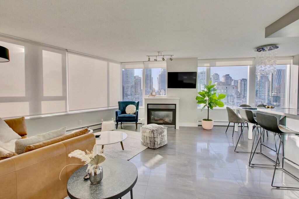 Feel at home in this Yaletown furnished 2-bedroom plus den rental, which features impressive high ceilings, luxurious marble floors, and modern decor. Upon entering, you'll find a grand foyer complete with a large pantry and a front hall closet with custom storage. The ultra-modern kitchen is finished with glossy white cabinetry and equipped with integrated white appliances, additional island space, a restaurant-quality hood fan, and a blue tile backsplash. The master bedroom offers optimal comfort with cozy carpets, a luxe headboard, a mirrored closet, and two dressers for extra storage space. You have direct access to the spacious balcony, which is equipped with a barbecue. Your rent includes one parking spot, internet, Netflix, and water. The close proximity to the Yaletown Roundhouse Station will make for easy travel. A one-time move-out cleaning fee of $250 applies. [SI]