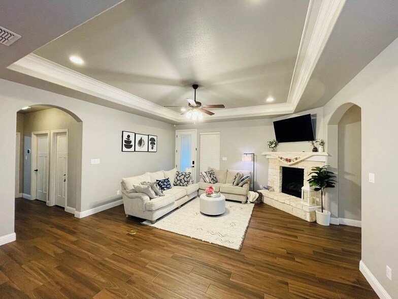 Stunning 3BR/3BA home in Enclave at Mission Ranch with 2 primary suites both w/ sep tub & shower, walk-in closets, high ceilings, barn doors, crown molding & tile floors. Chef's kitchen boasts granite countertops, stainless steel appliances, dual ovens, gas cooktop, LG fridge, RO & softener. Austin stone fireplace, gas heating, tankless water heater, smart thermostat, sprinklers & garage. Huge 8-ft fenced backyard w/ extended patio, lush lawn, gas line and garden bed.