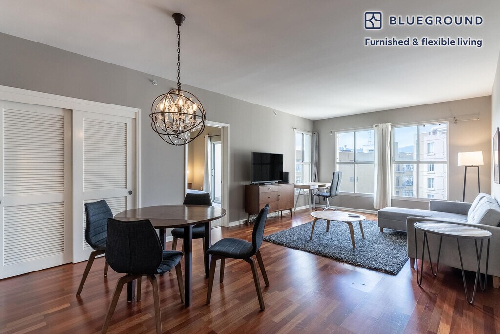 Show up and start living from day one in San Francisco with this beautiful two bedroom Blueground apartment. You’ll love coming home to this thoughtfully furnished, beautifully designed, and fully equipped SoMa home. (ID #SFO1679) The advertised rate of $5,150/month is the lowest available price, based on a 2 month(s) and 29 day(s) stay with a move-in date of November 1, 2025. If you’re looking for a 1-year stay, the rate is $5,870/month. Rates vary depending on the duration of stay, season, and other parameters. For exact pricing and additional pricing components, please visit our website and enter your desired move-in and move-out dates. The rate is applicable when billed upfront; it can be higher if billed in multiple payments. Brokers are welcome to reach out. Were you looking for an unfurnished lease? Try Blueground instead and upgrade from unfurnished to furnished living: - Furnished at rates comparable to unfurnished - No setup or furniture costs - save thousands - Move-in ready - save time, just bring your suitcase Designed with you in mind As with any Blueground apartment, you’ll find a thoughtfully designed space complete with beautiful furniture and a fully equipped kitchen in this two bedroom property. And, thanks to our superior quality mattresses, luxury linens, and towels, you can relax knowing you’ll always feel comfortably at home. When you’re ready for some fun, you can take in the San Francisco vibes or bring the entertainment to you with the premium wireless speaker or smart TV. This apartment also offers in-apartment laundry. Sleeping arrangements Queen Bed, 63in/160cm Queen Bed, 63in/160cm Amenities Building amenities unique to this two bedroom apartment include an on-site: - Dryer - Elevator - Washing machine - Pets allowed Arrival and ongoing support The entire apartment is yours to enjoy! Throughout your stay, you’ll have access to our Client Experience team through the Blueground App. You can schedule additional cleanings, submit maintenance requests, and view our neighborhood recommendations with just a few taps. We’ll share all details upon confirmation of your stay. Ideally Located This furnished apartment is located in South of Market, known as SoMa. A trendy, urban district, famous for its excellent art and museum scene. Home to a diverse mix of entrepreneurs and young families, this neighborhood offers hip bars, fine dinings and delicious coffee. Don’t miss the plethora of museums, including a visit to the San Francisco Modern Museum of Art. Baseball lovers frequently visit SoMa, as it is also home to the San Francisco Giants. Other things to note This Blueground apartment has flexible lease options, allowing you to book it for one month, a year, or more. Pets are welcome, though weight limits and breed restrictions apply and may incur fees. We take great pride in ensuring every photo displayed is shot in our own units with our actual furnishings. That said, we regularly refresh our decor and furniture arrangement, which may differ from what’s pictured. Also note - On-street parking near the building is not allowed