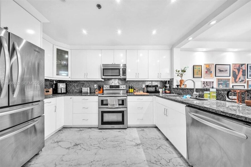 This spacious 2-bedroom, 2-bath plus it has a versatile flex 3rd room ideal for an office, den, or guest room. This boutique condo unit has 3 parking spaces (only one is covered) features an extra-large front-loading washer and dryer, a generous primary bedroom with dual vanities and a walk-in closet, and custom closets throughout. The bright kitchen offers stainless steel appliances, blue marble countertops, and impact windows and French doors opening to a private balcony. Additional highlights include new central A/C, assigned garage parking, and a storage locker. La Hacienda is a boutique 38 unit building with a rooftop gym, party room with large terraces, a beautiful pool with bar and covered entertainment area, and secure entry. Located on a quiet, tree-lined street near Miracle Mile with plenty of guest parking.