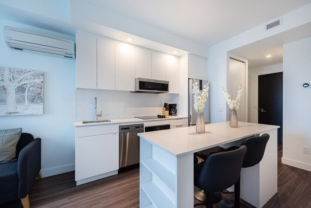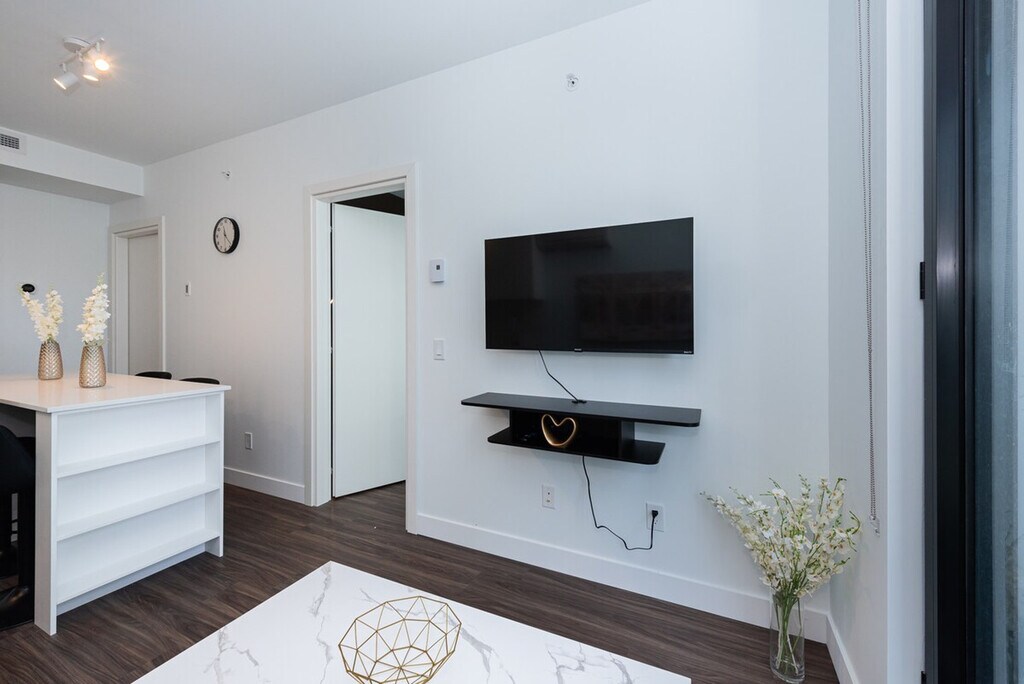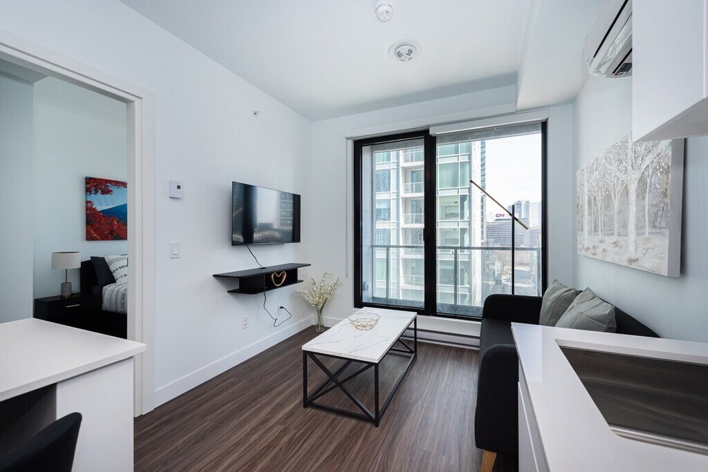 Located in the bustling downtown core of Montreal, adjacent to the Bell Centre, this property epitomizes luxury and practicality, setting a new benchmark for urban living, especially tailored for young professionals, newcomers, and students. Situated mere steps away, you will enjoy easy access to the attractions of the Golden Square Mile and the historic charm of Old Montreal. This development fosters an environment ideal for both academic pursuits and professional development. This new condo is very well located near the Bell Centre, just steps away you have access to the Golden Square Mile’s attractions. It features 1 bedroom with 1 double bed and 1 bathroom. Indoor parking with in and out privileges is available for an additional fee, depending on your length of stay. We offer a variety of cleaning services that include bi-weekly or monthly options, available for an extra charge. Situated mere steps away, you will enjoy easy access to the attractions of the Golden Square Mile and the historic charm of Old Montreal. This development fosters an environment ideal for both academic pursuits and professional development. No parties of any kind or loud noises that can alter the harmony of residents are allowed. No smoking of cannabis, cigarettes, or any kind inside the apartment, balcony, or the building is permitted. Please care about your home away from home. Includes shared workspaces, a conference room, and a workspace with a view. A laptop computer is not included.