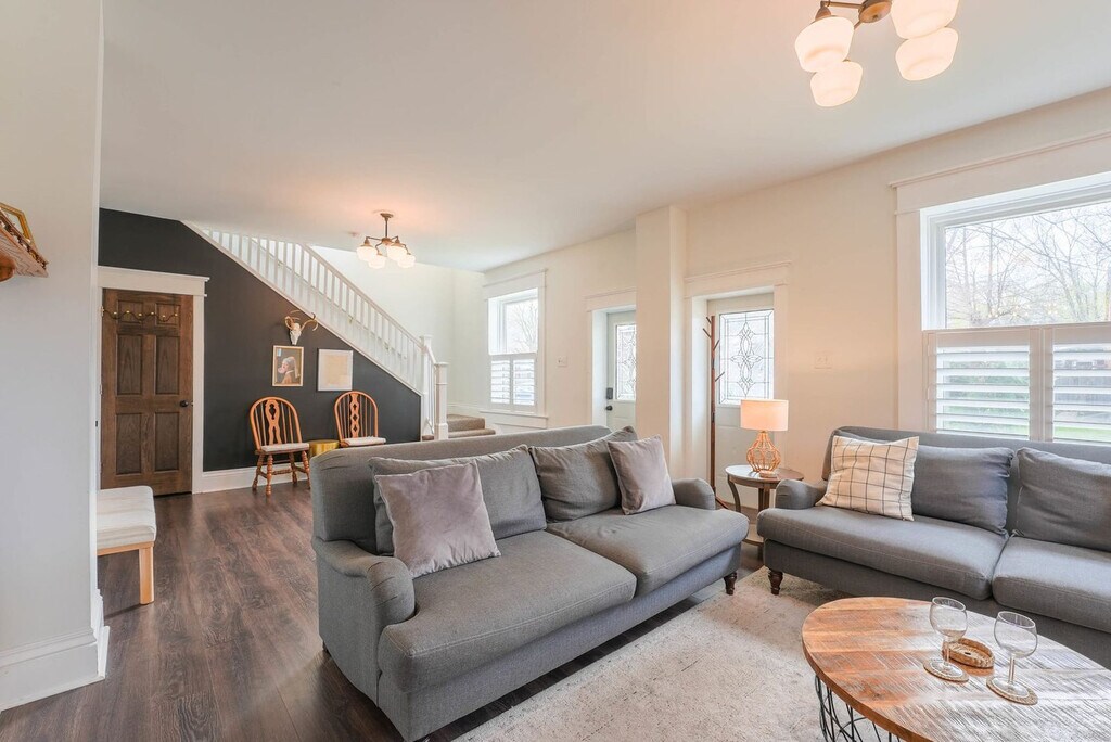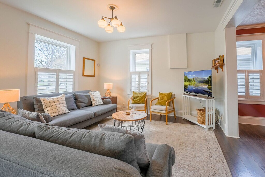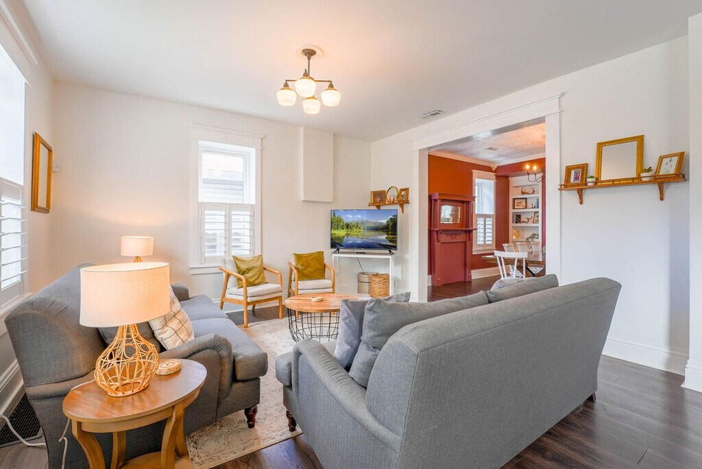 Experience St. Charles from your own historic farmhouse. This charming 19th-century farmhouse offers four bedrooms and three baths, making it perfect for families and groups. Enjoy the twinkle-lit backyard with a fire pit and patio for relaxing evenings. The fully stocked kitchen and spacious dining area are ideal for home-cooked meals. With a dedicated workspace and fast Wi-Fi, this home is remote work-friendly. The pet-friendly fenced yard allows you to bring up to two dogs, with a fee applicable. Located within walking distance to Main Street shops, cafés, and the Katy Trail, this farmhouse offers a perfect blend of vintage charm and modern comforts. Step into your own piece of history in the heart of Frenchtown. This beautifully restored farmhouse blends vintage charm with modern comforts, offering a warm and inviting retreat for up to eight guests. The main floor features a king bedroom next to a full bath with a walk-in shower. Upstairs, the primary suite includes a king bed and a private bath with a clawfoot tub and walk-in shower. Additional bedrooms include another king bed and a queen bed, with a shared upstairs bath featuring a tub/shower combo. The fully stocked kitchen offers stainless appliances, a spacious island, and all the essentials for preparing delicious meals. Gather around the dining table or relax in the cozy living room with plush seating and a smart TV. Your private fenced backyard features twinkle lights, a fire pit, a BBQ grill, and plenty of seating, making it a perfect space for morning coffee or evening s'mores under the stars. Pets are welcome, with up to two house-trained dogs permitted for an extra $75 per pet per stay. Free on-street and off-street parking is available, making it simple to arrive by car. Welcome to St. Charles, Missouri, nestled in the historic Frenchtown district. The neighborhood offers the perfect blend of small-town charm and modern convenience. You're just blocks from Main Street’s cobblestone streets, lined with boutiques, cafés, breweries, and the Katy Trail along the Missouri River. Nearby attractions include the Lewis & Clark Boat House & Museum, unique stores and eateries, Lindenwood University, Family Arena, and Historic downtown St. Louis. The Katy Trail and Missouri Riverfront are perfect for biking, jogging, and scenic strolls. Whether walking, cycling, rideshare, or driving, it’s easy to explore St. Charles and beyond from this central location. The property is about 25 miles from St. Louis Lambert Airport, approximately a 30-minute drive. Main Street and the Katy Trail are both within a short walk. The property is equipped with a noise monitoring device for the comfort of all guests and neighbors. Quiet hours are from 9 PM to 8 AM. Smoking or vaping inside the home is prohibited, and no parties or events are allowed. Respect check-in after 4 PM and checkout by 10 AM times. Starter supplies like toilet paper, paper towels, and toiletries are provided to get you started, but guests may need to purchase additional supplies for extended stays. A personalized door code will be sent before check-in for a smooth arrival. Verification of contact information and acknowledgment of house rules are required before check-in instructions are provided. Enjoy access to laundry facilities in the garage, high-speed Wi-Fi, and a dedicated workspace for remote work. A laptop computer is not included. Registration Number: 2024-23-5799 [SI]