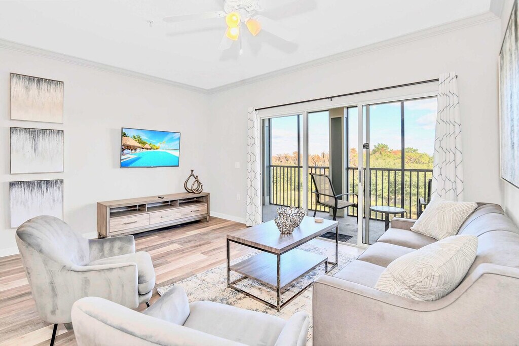 Feel at home in this stunning 2-bedroom condo located in the Palisades Condominiums. This spacious unit features a massive private sundeck and can comfortably host up to 6 guests. This condo offers a fresh, modern design with luxury bathrooms and sleek finishes. It features a large luxury private furnished patio, a covered outdoor dining area that seats six, a private outdoor lounge, sun recliners and umbrella shades, and a screened-in patio dining area that seats four. The spacious living room includes a Frozen mural, and there are smart TVs and a high-speed internet connection. The fully equipped kitchen has new stainless steel appliances, kitchen bar seating for four, and an indoor dining area with a Disney character mural for four. In-suite laundry machines and central air conditioning are also included. Complimentary access to building amenities is provided, and the condo is 1288 sq.ft. A pack 'n play crib and a highchair are available for $40 each (one-time fee). Pets are welcome with a fee of $99. Palisades Condominium is right off the 192, with easy access to a great selection of restaurants, shopping spots, and entertainment. Nearby family attractions include Walt Disney World (3.7 miles), Orange Lake Golf Course (2.3 miles), Highlands Reserve Golf Club (6 miles), Disney's Blizzard Beach Water Park (6.6 miles), Disney's Animal Kingdom (7.6 miles), Hollywood Studios (9.6 miles), Epcot (9 miles), SeaWorld (15 miles), and Universal Studios (19.8 miles). Quiet hours are between 11 PM and 7 AM. Parties, events, and smoking/vaping of any kind are prohibited in or around the property and risk a fine of $150. Late departures will result in a fine of $150 for each additional hour the property cannot be accessed for turnover. Firearms and weapons are strictly prohibited. To keep everyone safe and comfortable, only one pet up to 40 lbs is allowed. If you're bringing a pet, please share the breed and weight in advance. The indoor dining area for 4 can double as a laptop-friendly workstation. [SI]