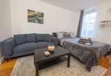 Feel at home in this charming and stylish fully furnished studio apartment located on the third floor of a walk-up building, just three flights up. This apartment offers all necessary amenities for a comfortable stay, including a queen-size bed and a sofa, a desk, a mirror, and air conditioning. The apartment is fully furnished and features a fully equipped kitchen with a large refrigerator, stove top, oven, coffee maker, toaster, microwave, and all the utensils and cutlery you might need during your stay. Enjoy the good-sized marble bathroom with both a shower and a bathtub. We also provide all bed linen and towels, as well as an iron and a hair dryer. Laundry facilities are available in the basement. Located in the Upper East Side, this apartment is surrounded by the trappings of wealth and high society. Enjoy proximity to Central Park, Madison Avenue's flagship boutiques, and some of the most fantastic museums in the country, including the Metropolitan Museum of Art and the Solomon R. Guggenheim Museum. Public transportation is easily accessible with the 6 Train on E 77th St & Lexington Ave and the M15 Bus to downtown at E 74th & 2nd Ave. Smoking inside or outside of the house will result in a penalty. Pets are not allowed. Luggage storage is not available, so please use a service like to store your luggage before check-in or after check-out. All guests must respect quiet hours ranging from 10 pm to 7 am. The apartment must be used for vacation purposes only, no commercial use. If the electric bill exceeds the average monthly bill of $100, the guest will be billed for overage. You cannot receive mail at this address, please consider opening a PO Box. Check-out time is at 11:00 AM, and all dishes should be placed in the kitchen sink and all trash in the trashcans before departure. Kindly note that a $350 refundable security deposit is required and will be collected directly by the partner after your booking is confirmed. The security deposit will be handled through direct communication with the partner and is not processed automatically.