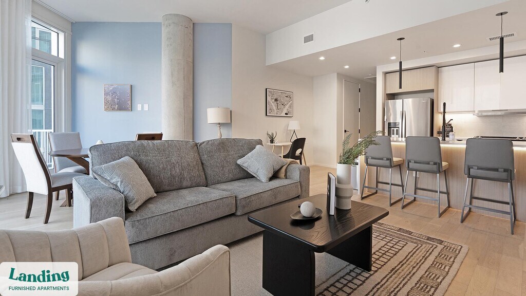 Landing offers flexible lease terms from weeks to months. Please always visit our website or contact us for the latest pricing & availability. Stay longer, save more: 6-Month Minimum base rent: starts at $3740/mo 12-Month Minimum base rent: starts at $3330/mo Landing offers flexible leases across a network of over 35,000 fully-furnished apartments throughout 375+ cities so you can rent on your terms, practically anywhere, and avoid the hassle of paying deposits or application fees. Visit to learn about all the benefits of a Landing membership, see our competitive up-to-date pricing, explore available apartments, take virtual tours, and make reservations online without jumping through traditional rental hoops. Landing's apartments at The Floodgate are designed for comfortable, easy living, with the ability to stay as long as you like. Experience living with Landing Every apartment is outfitted with all the modern essentials including: custom-designed furnishings, a fully-equipped kitchen with deluxe stainless steel appliances, a gourmet coffee maker, premium linens, Smart TVs, and incredibly fast, reliable internet for working from home. When you live with Landing, you'll enjoy a hassle-free experience with the added benefit of 24/7 access to our dedicated member experience team. Some of the nitty-gritty: a background check and proof of income are required; we're completely smoke-free; bundled utility packages and pricing vary based on length of stay; pet-friendly options available; listed price reflects a 12-month minimum stay.